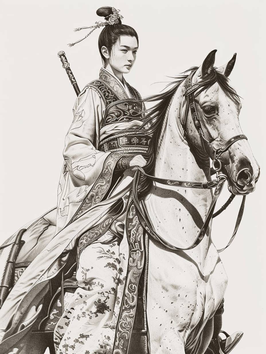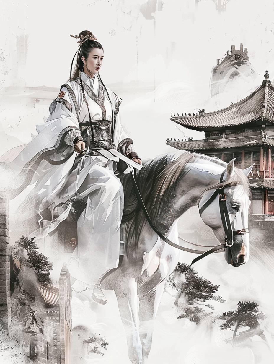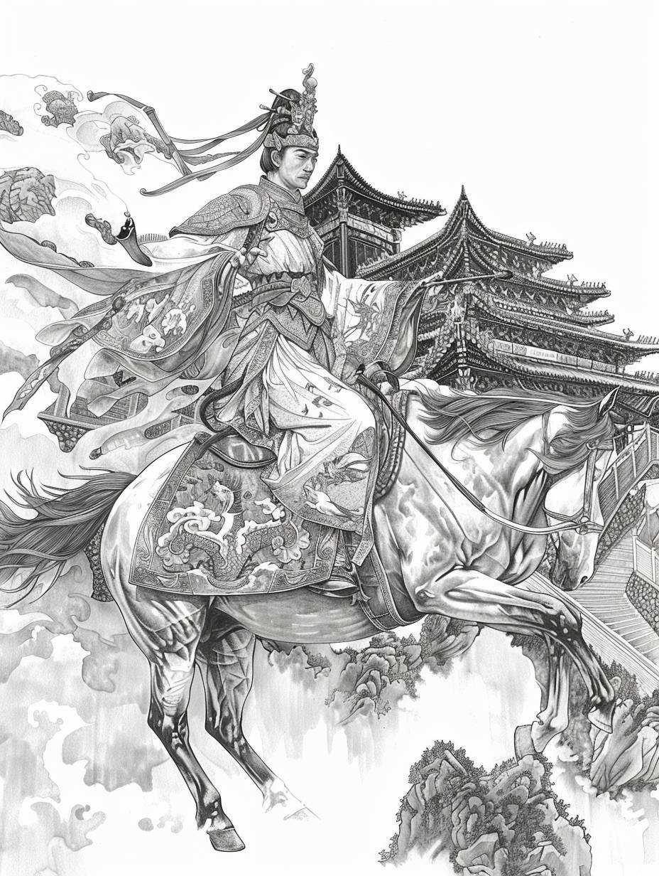 monochrome, architecture, Chinese architecture, white background, highlights (coloring), hanfu, palace, frescos, horse, horseback riding --ar 3:4 --v 6.0