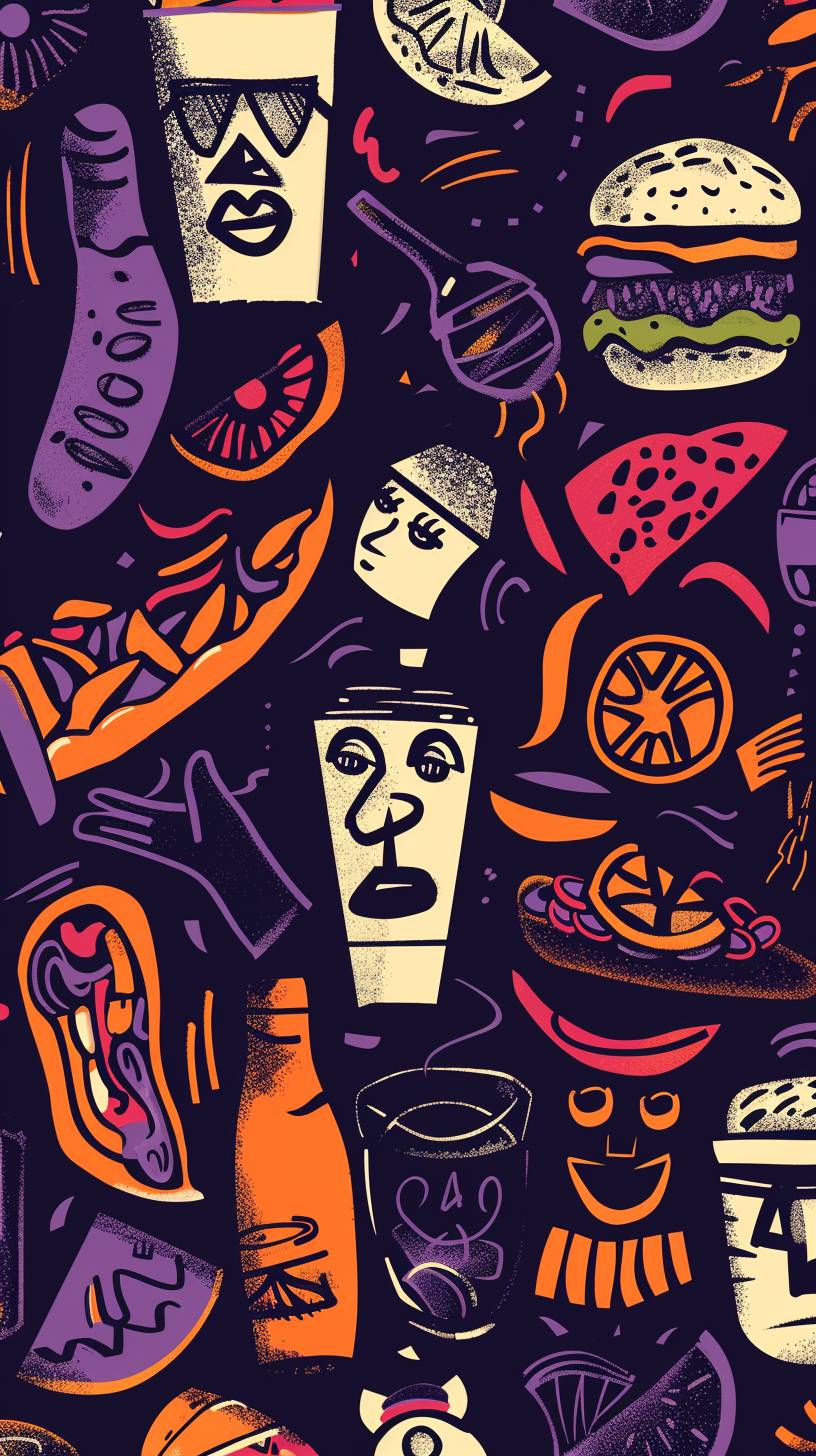 バスキアスタイルのアイコン、ダイニングアイコン、配達アイコン、横に配置、紫色