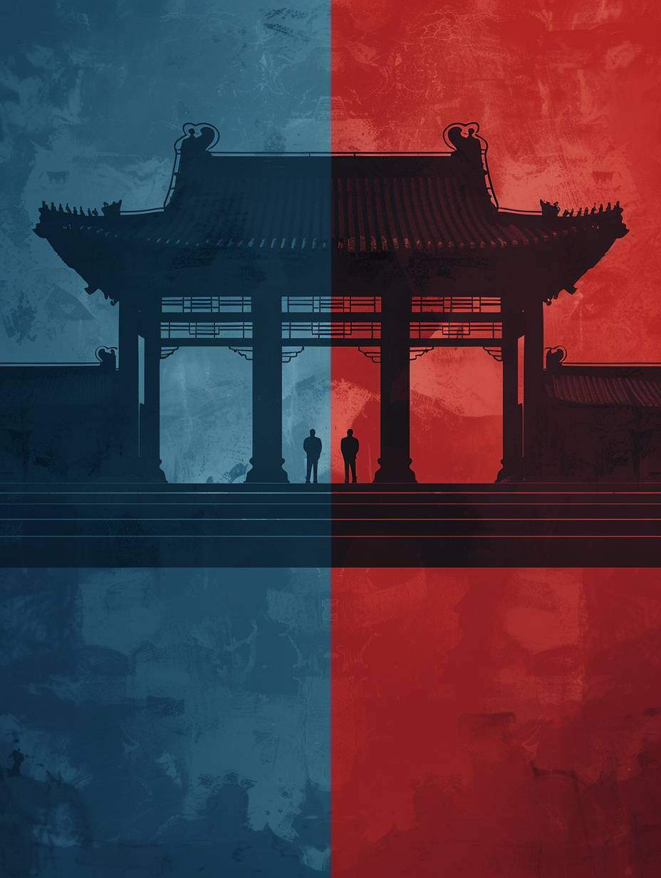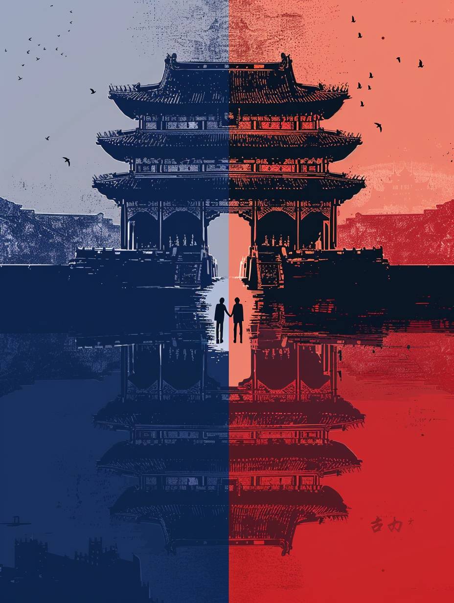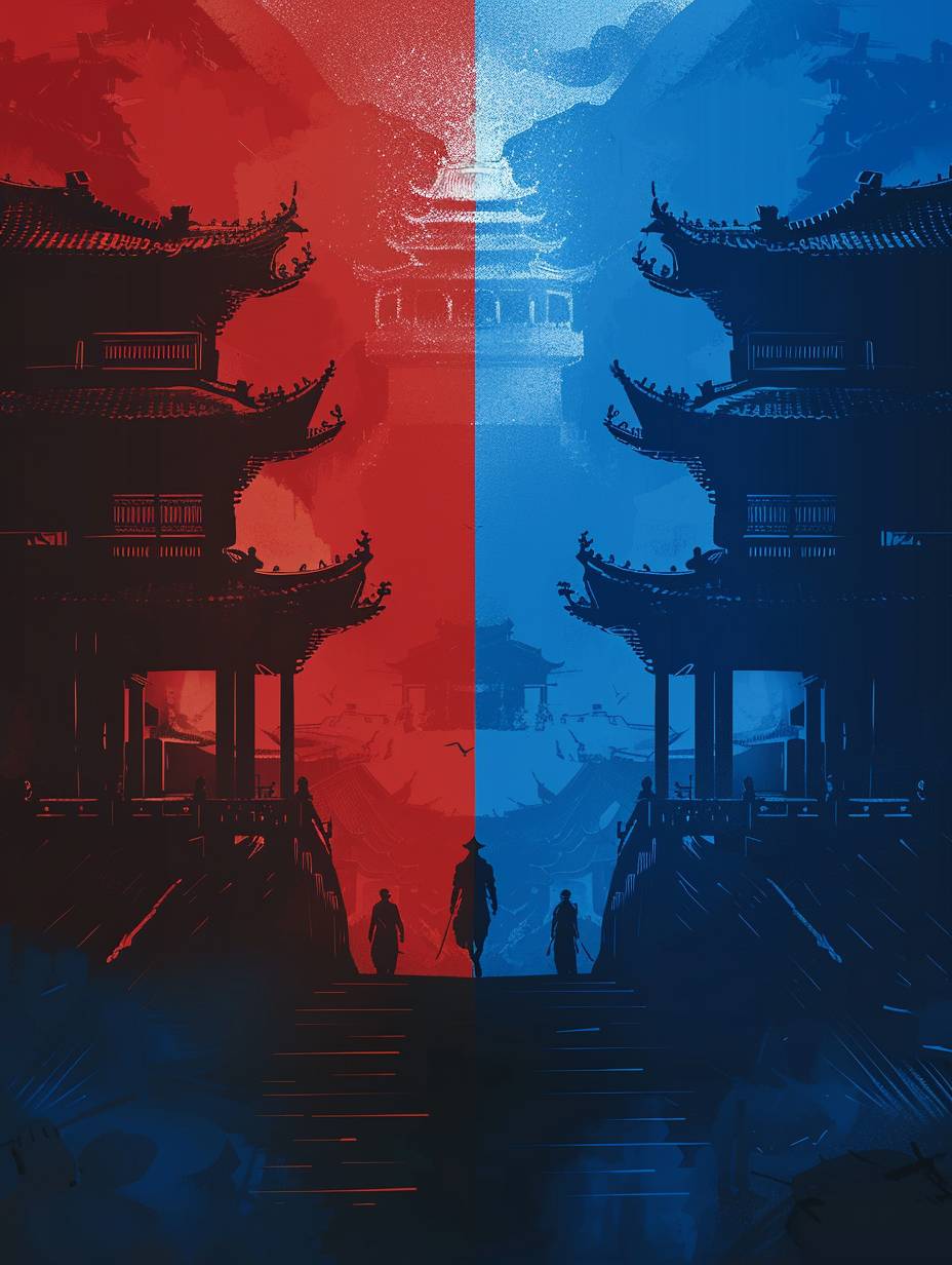 Minimalist film poster design, vector style, ancient Chinese palace, silhouette figures, simple lines, film composition, upper and lower symmetrical composition, red and blue tone, film lighting --ar 3:4 --v 6.0