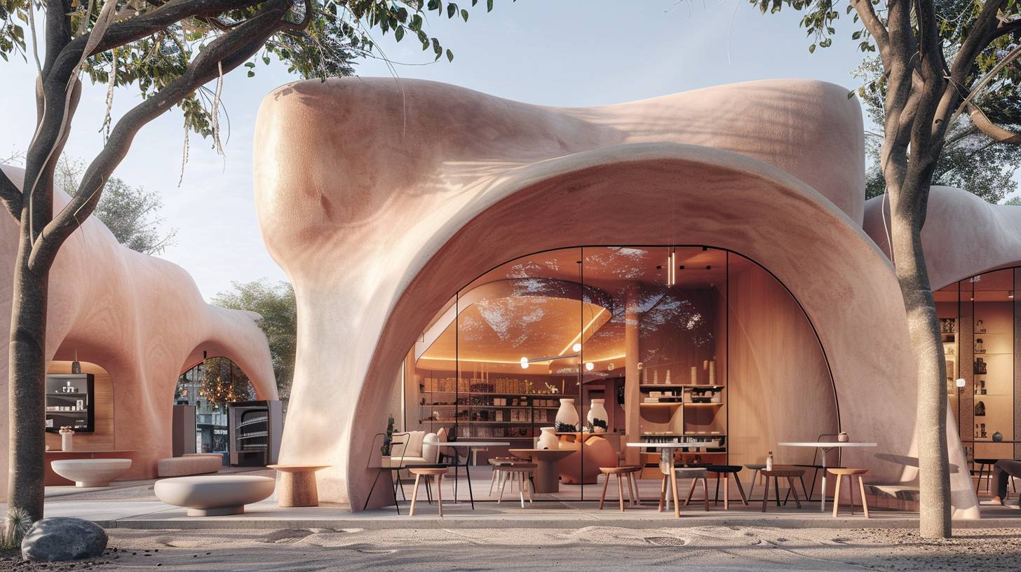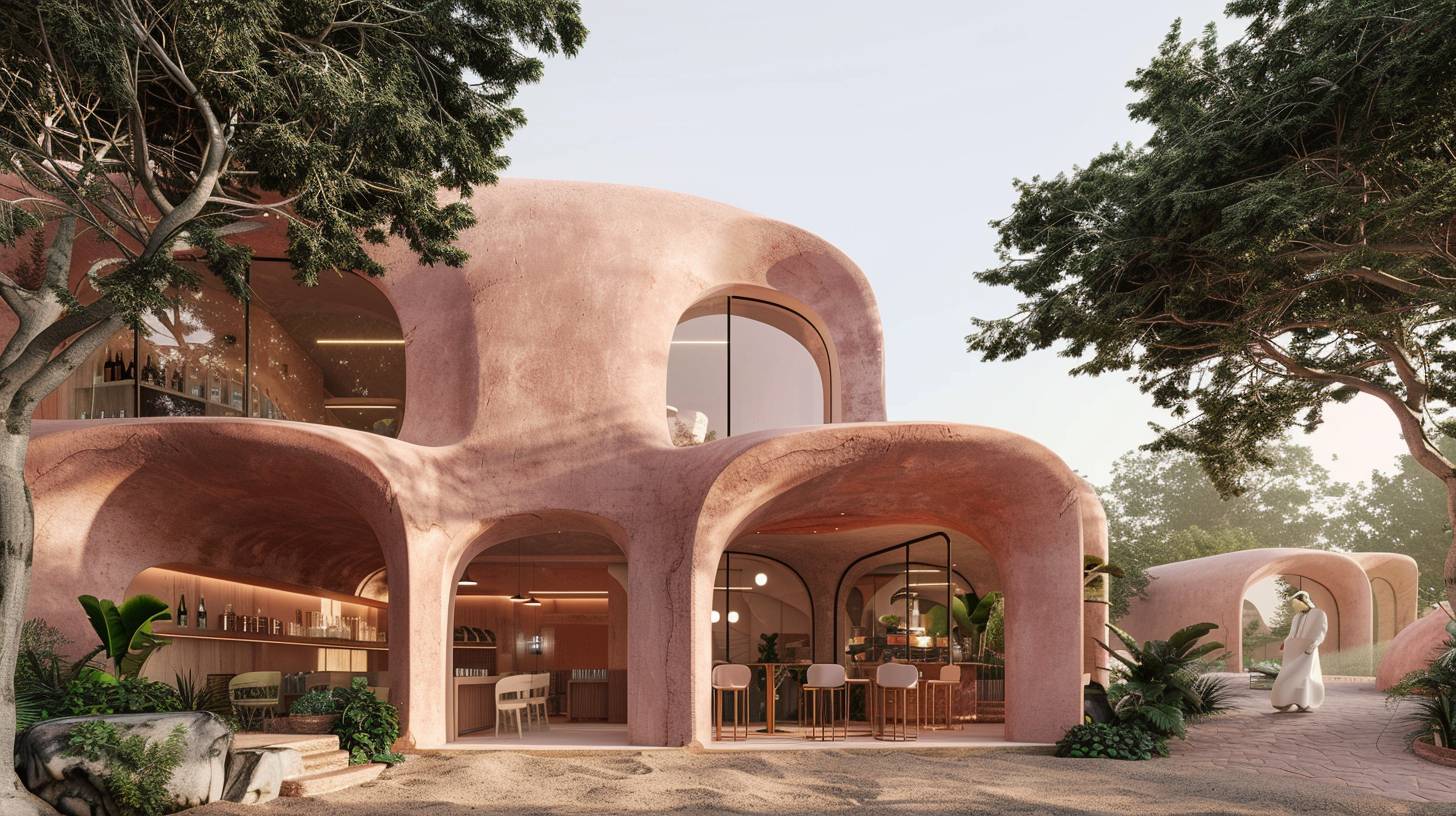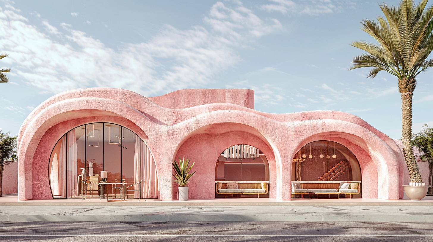 遠景、モロッコ通りにあるローズクォーツ素材で作られたオーガニックな形状のラウンドコーナーを持つカフェの外観デザイン、豪華