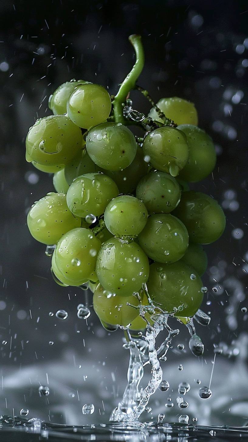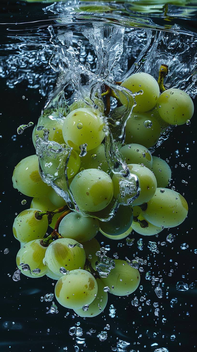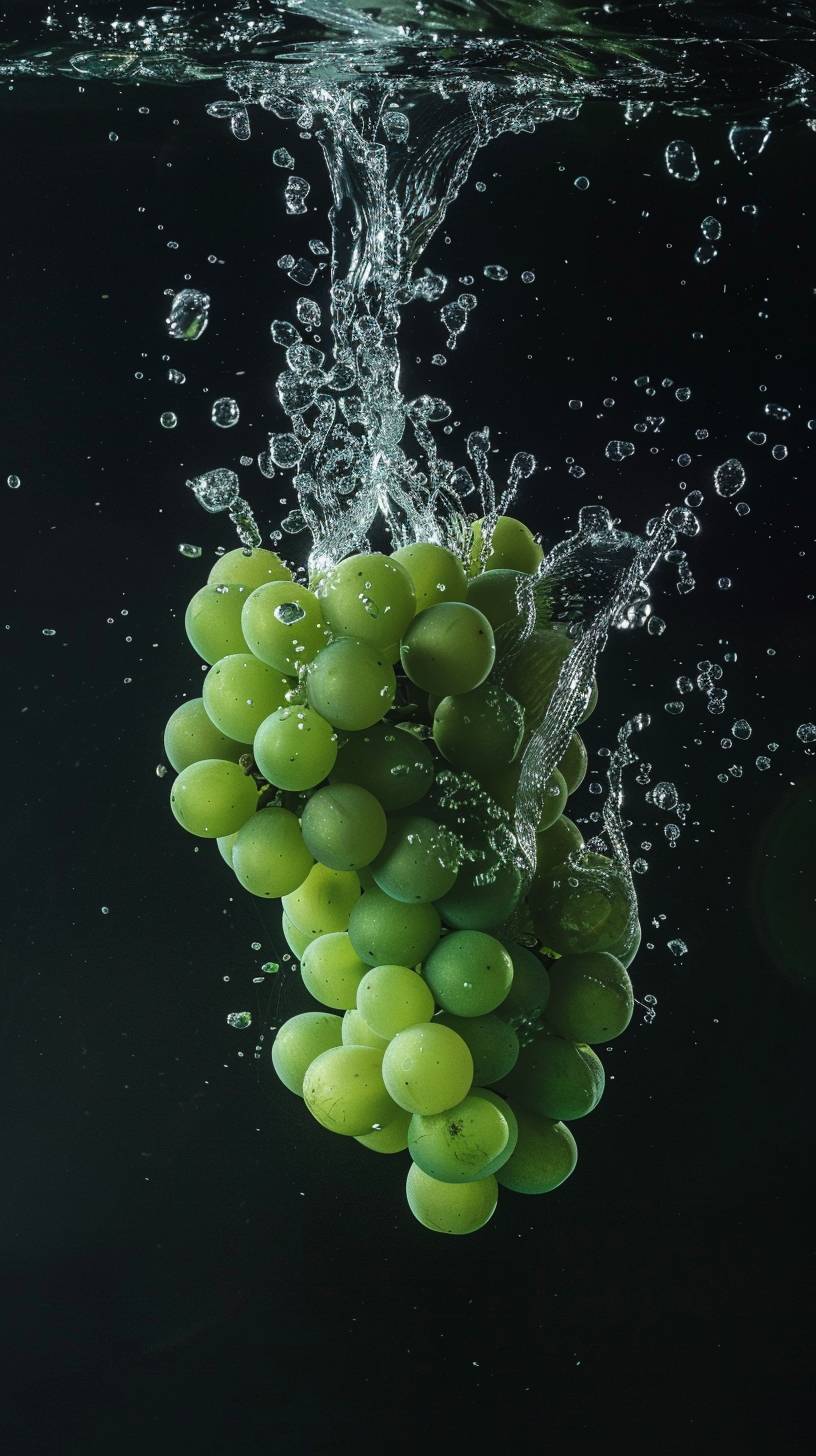 a high speed photo of green grapes falling down into a water dowl , splash cinematic style --ar 9:16 --style raw --v 6.0