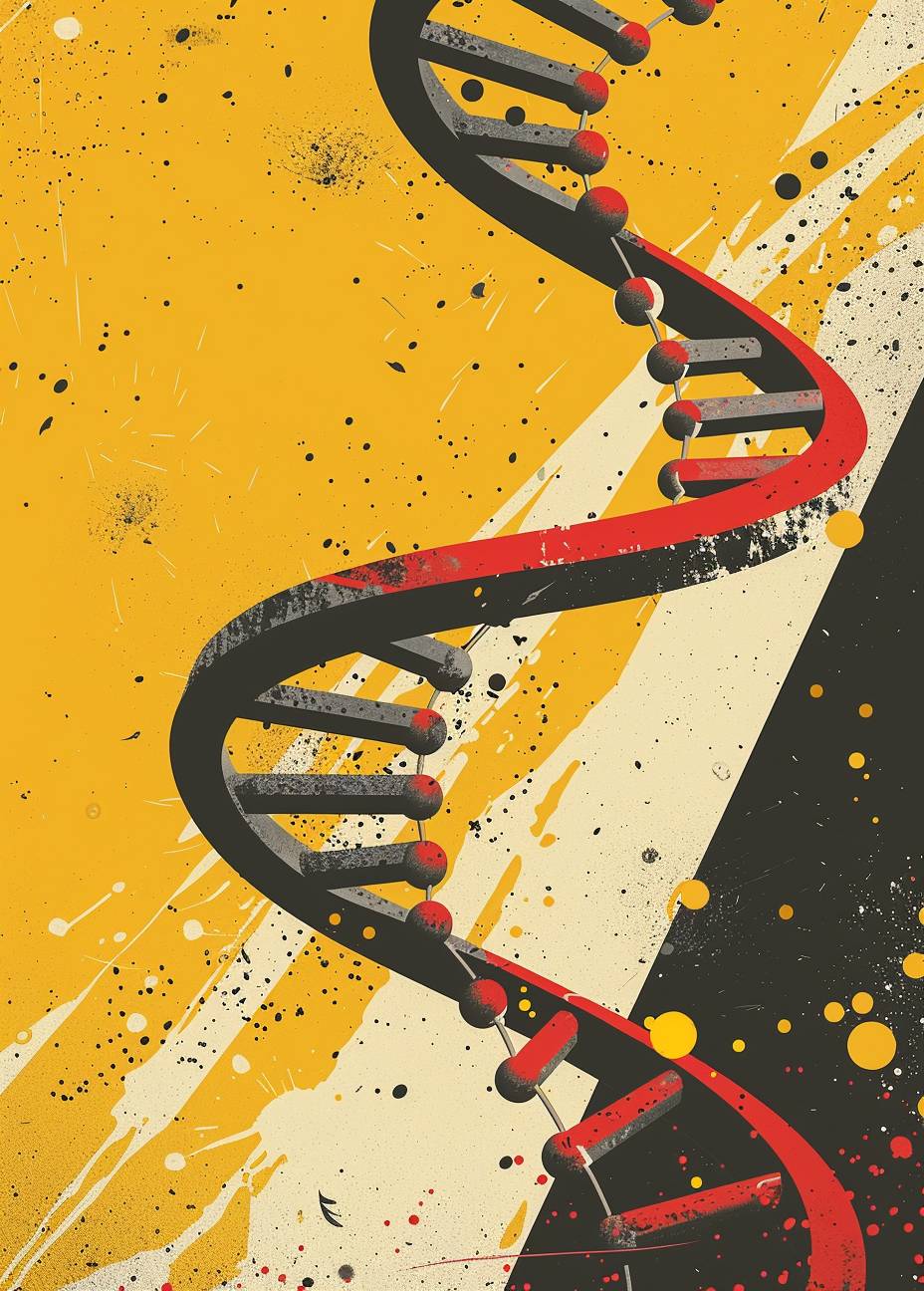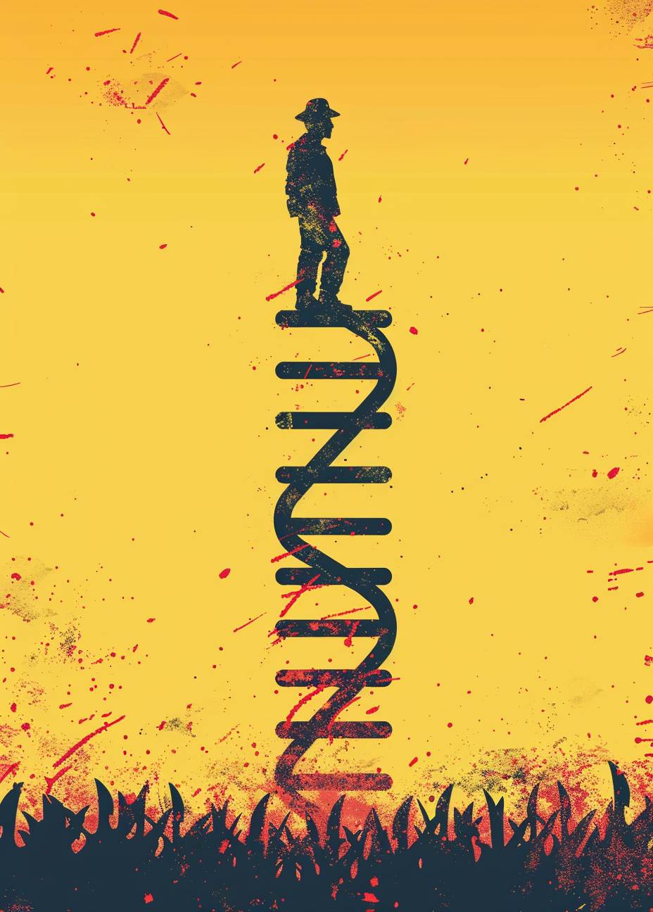 農場の人と二重らせんの梯子、黄色の背景、ミニマリストカートンスタイル、赤と灰色のカラーパレット、農場からテーブルへのスタイル。