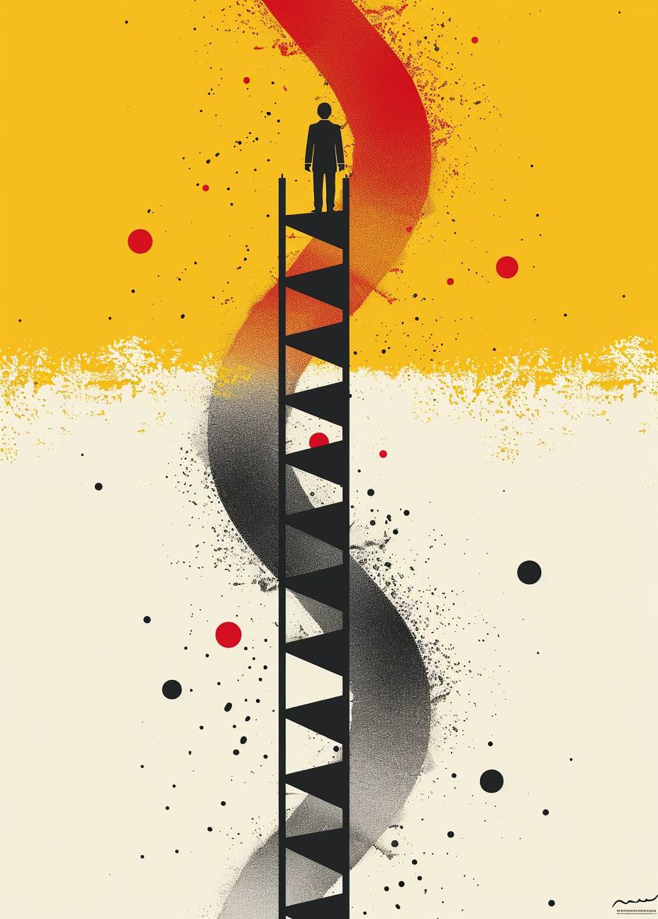 農民と二重らせんのはしご、黄色の背景、ミニマリストなカートゥーンスタイル。