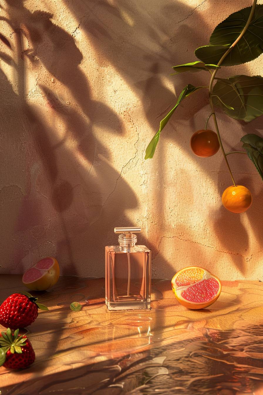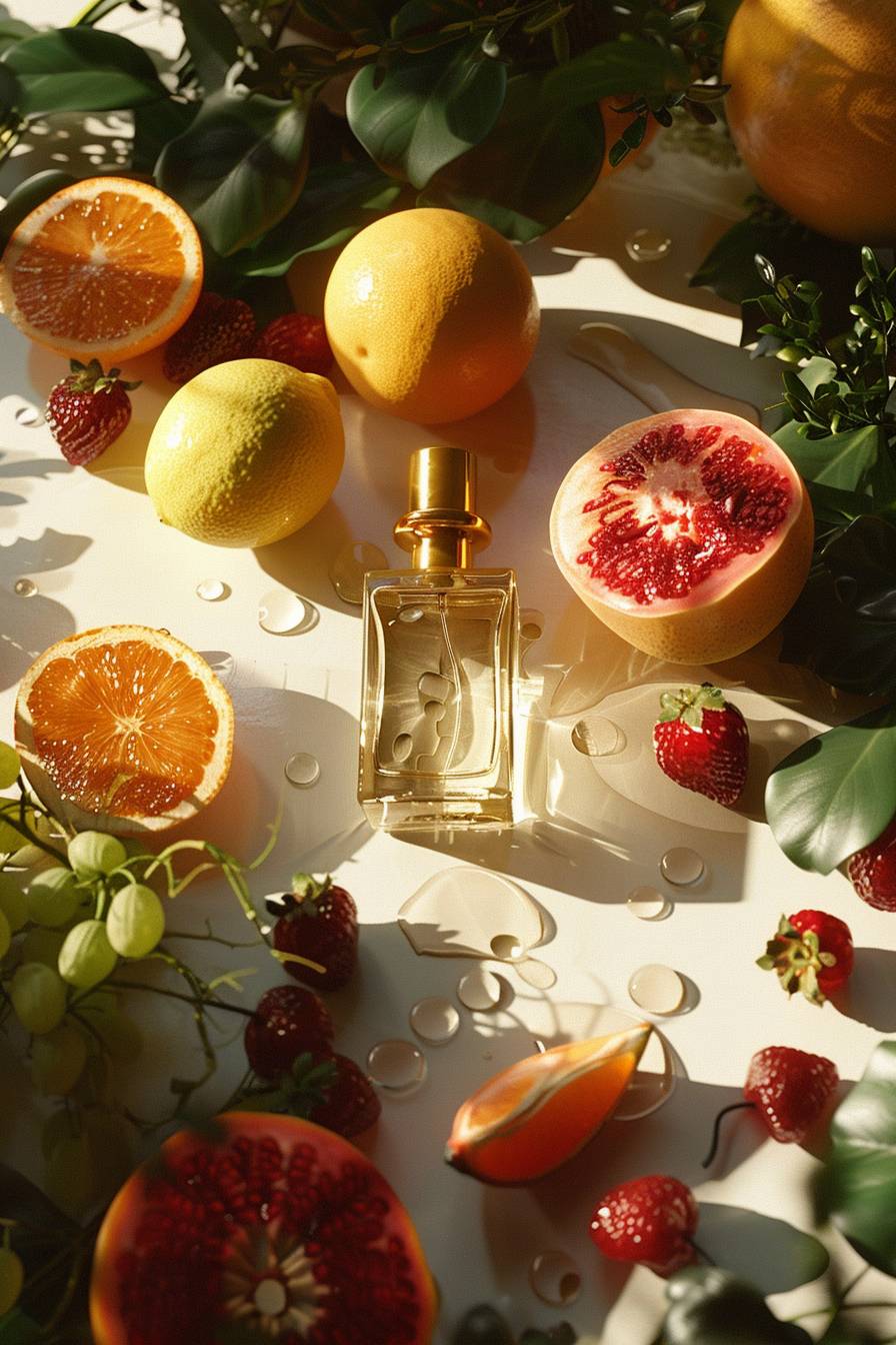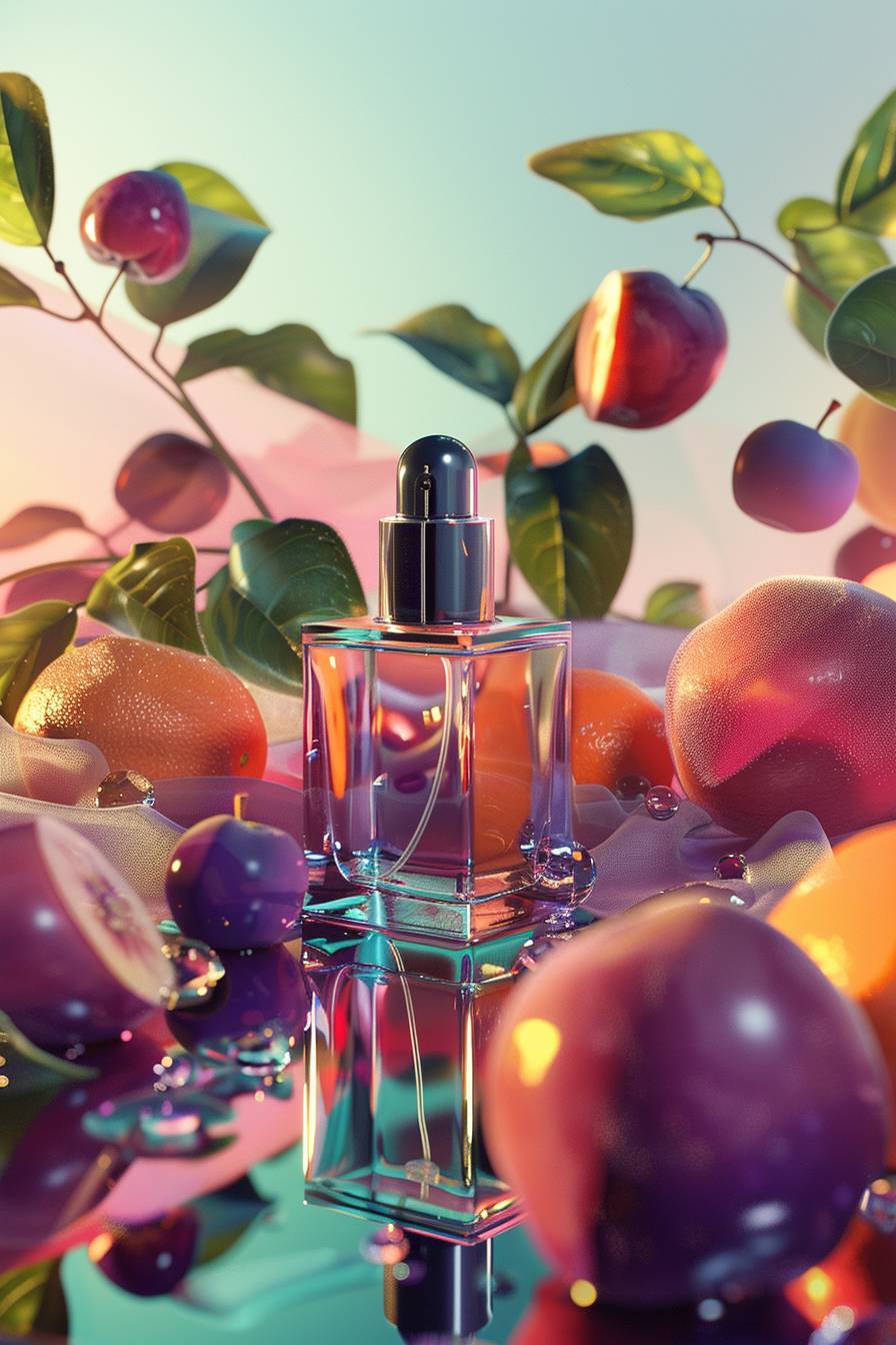 Top of the range fragrances, fruits top notes,based on Typology brand or Polène brand, immersive filming, top advertising shots, top visual presentation of goods, Product photography, 3D rendering, advertising, cosmetics, perfume, stunning realism --ar 2:3 --v 6.0