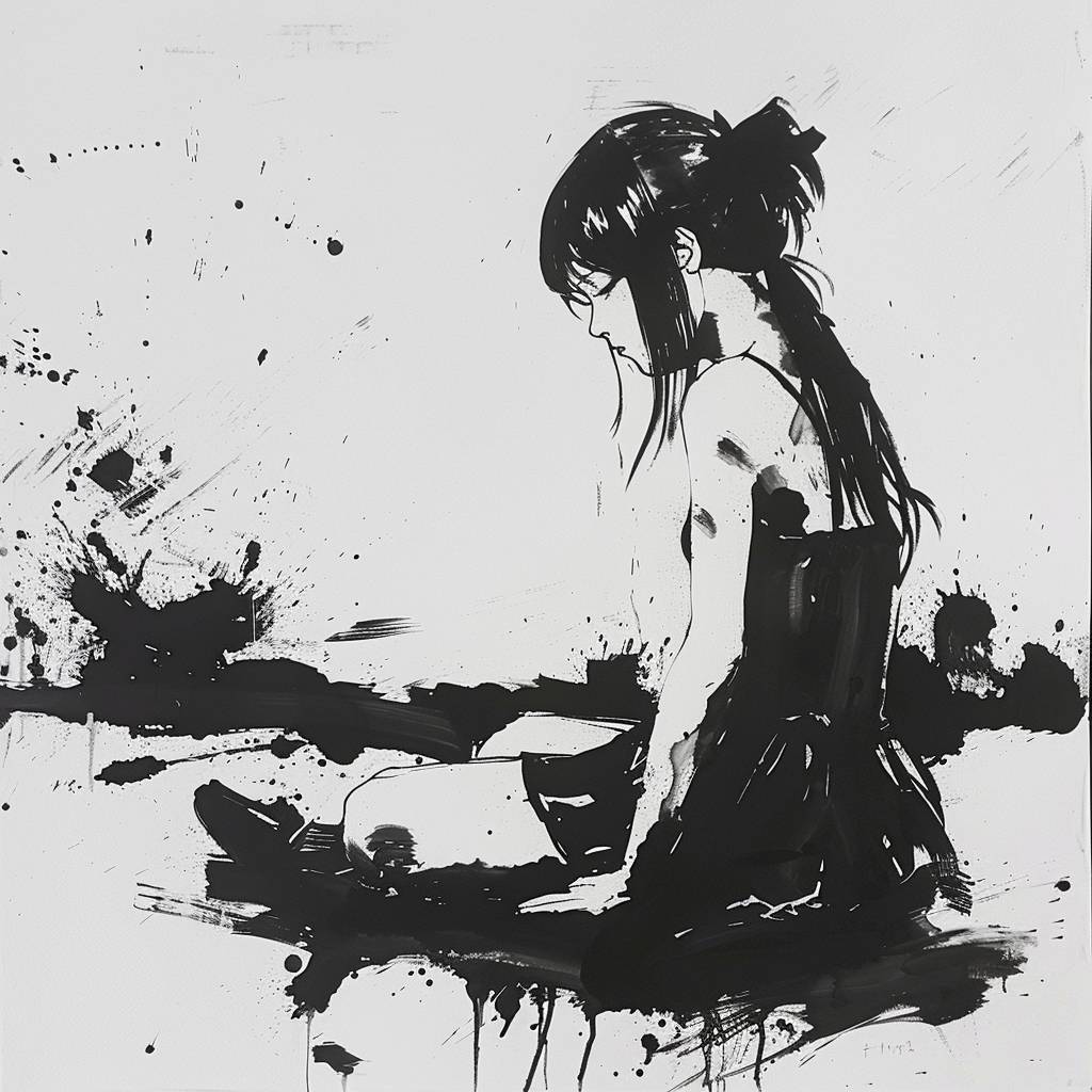 sumiインク画、一人の女の子、私は愛されたい、たくさんでも少しでもいい。私は愛したい。私は優しくありたい。私は正直でありたい。冷たさにはもう十分だから。私は温かくありたい。ただ温かく。(ショートシフトドレス)、ランダムなポーズ