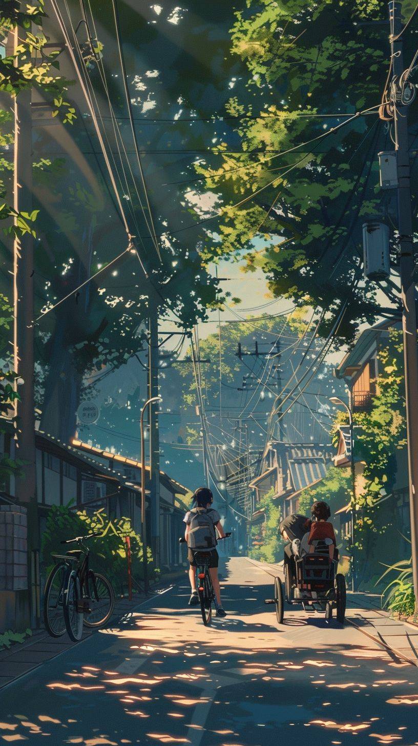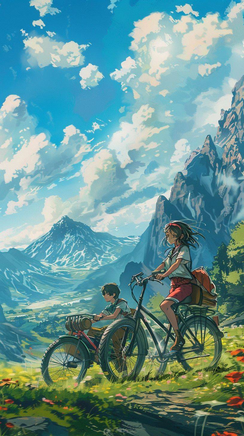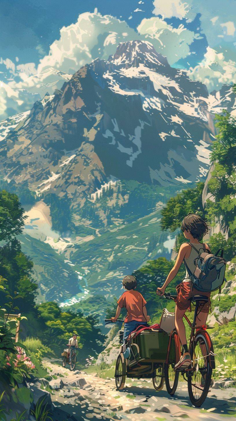 女の子が自転車トレーラーで彼氏を引いて電動自転車に乗り、驚くべきスピードで走り、好奇心をそそる環境で、エクストリームサイクリング、8K、アニメ。