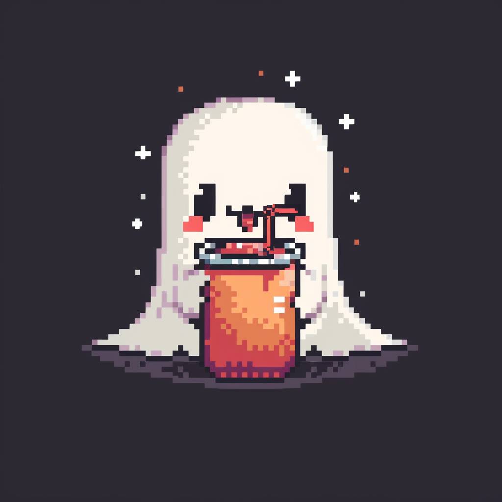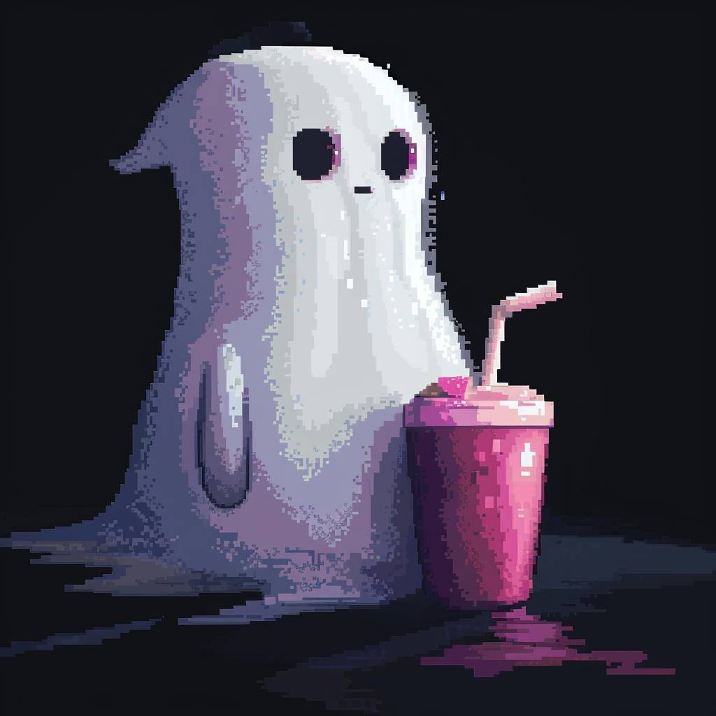 a cute white ghost drinking a smoothie , with a black background pixel style --v 6.0