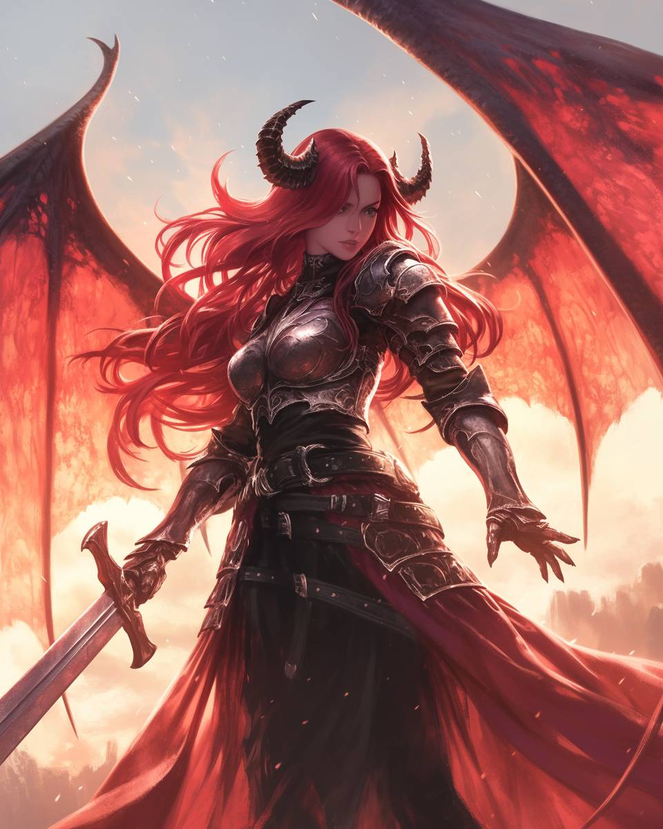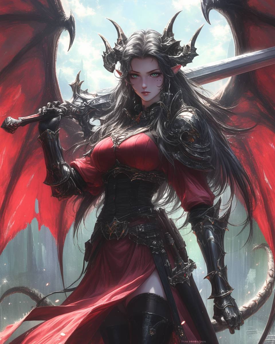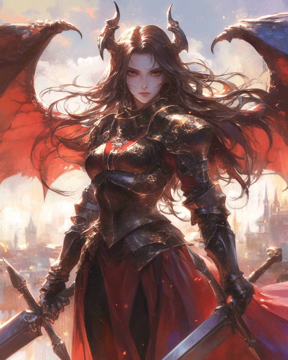美しい女性騎士と赤いドラゴンのリアルなマンガスタイル