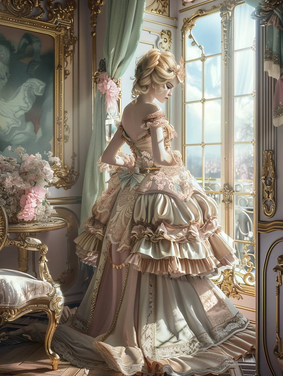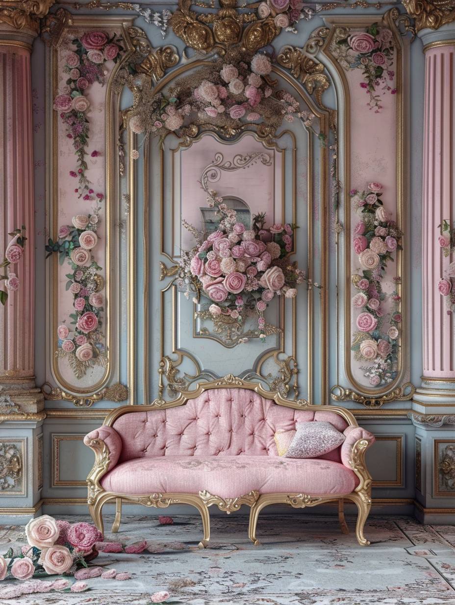 ロココ様式で、優雅で華麗なディテール、金のアクセントとパステルカラー