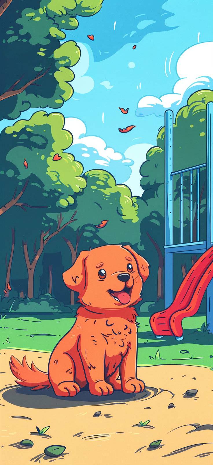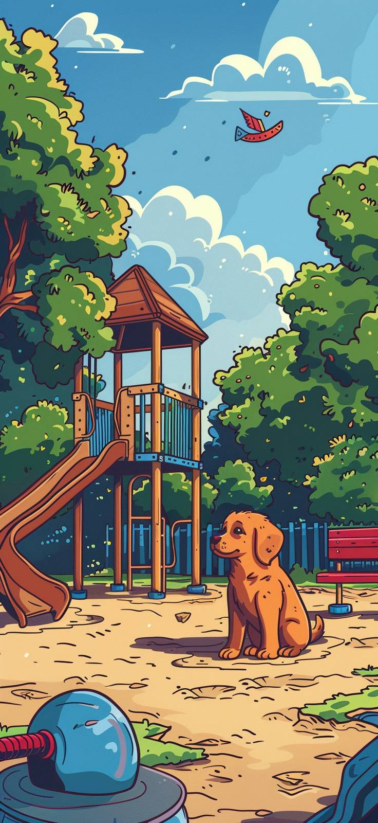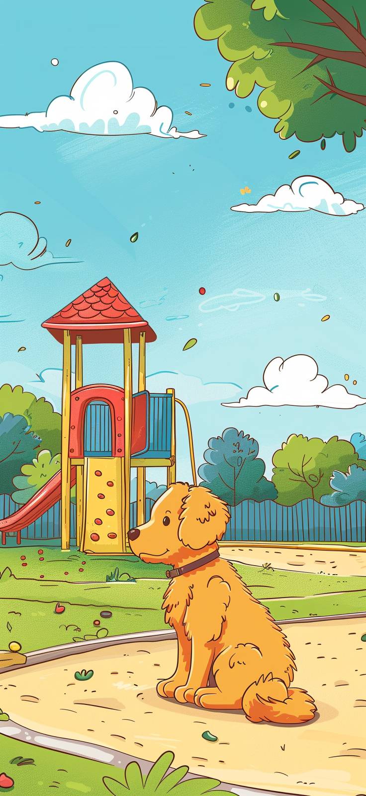kids illustration , dog in a playground, cartoon style, thicks lines, low detail, vivid color --ar 215:466 --stylize 250 --v 6.0