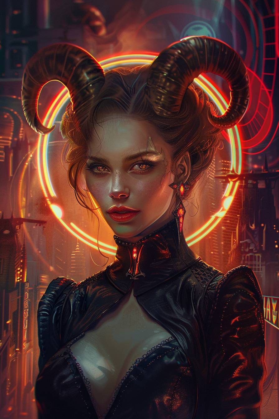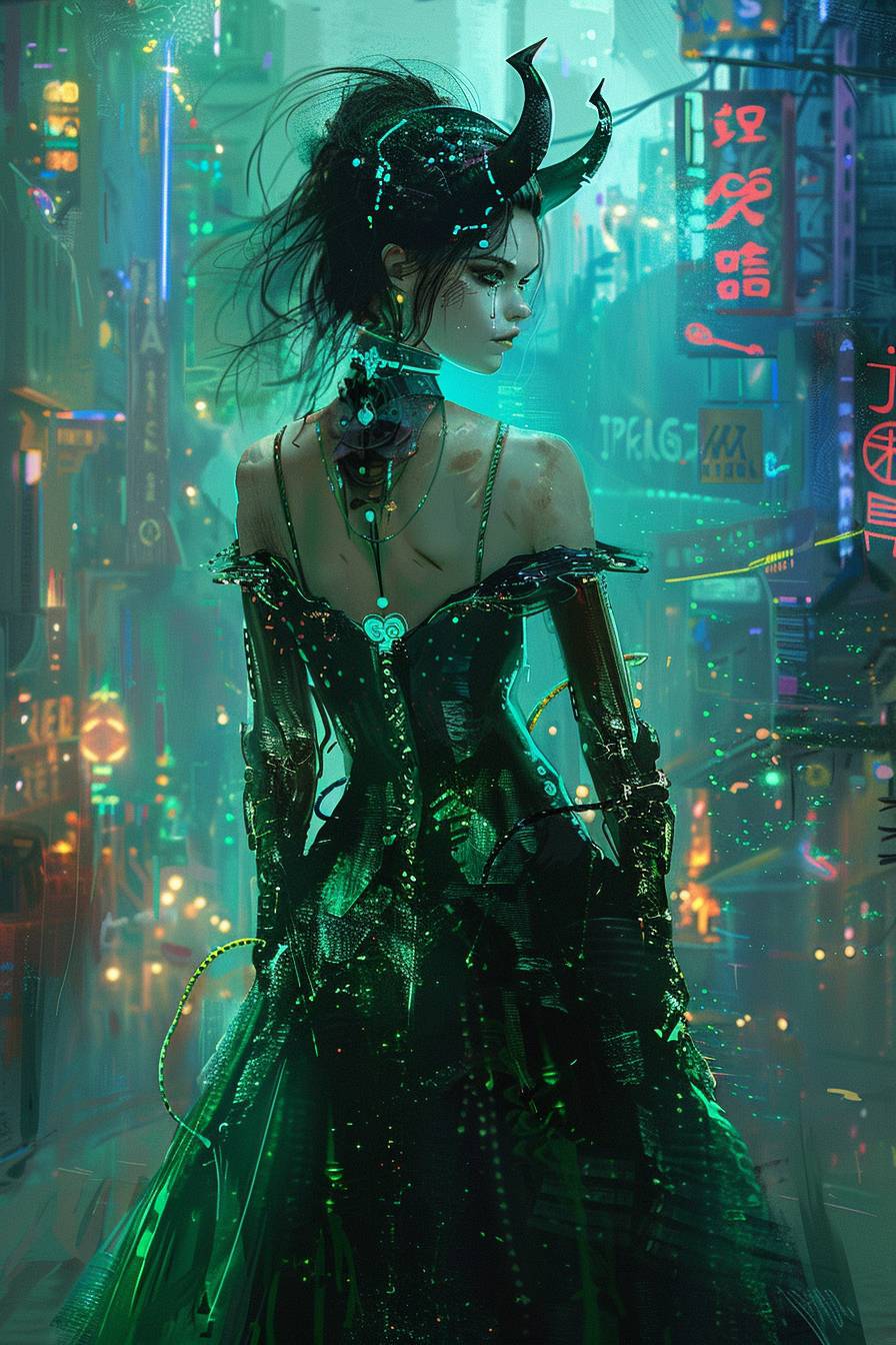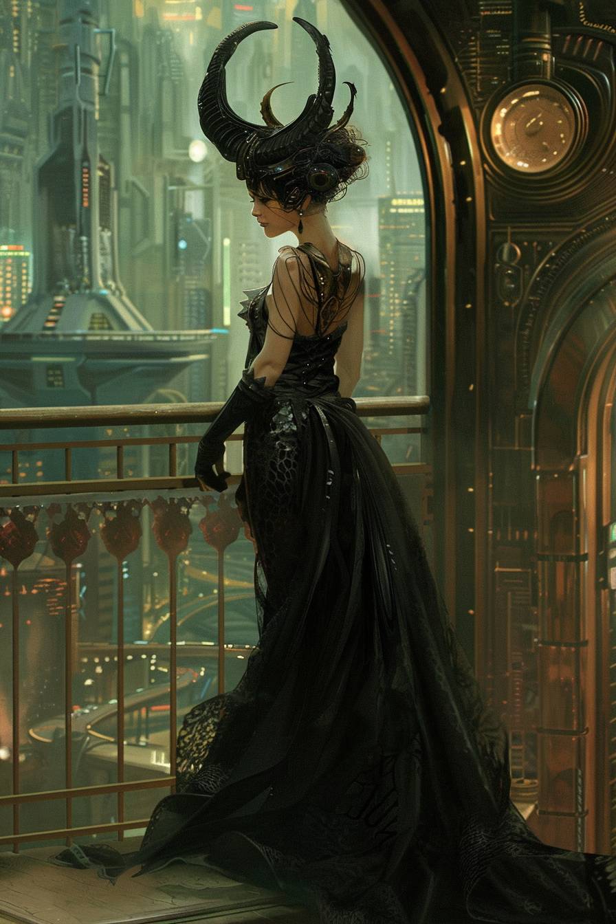 A digital illustration of a woman with horn-like hair and a latex gown, set against a cyberpunk backdrop, blends elegance with fantasy. --ar 2:3 --v 6.0