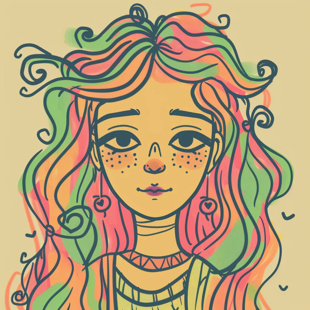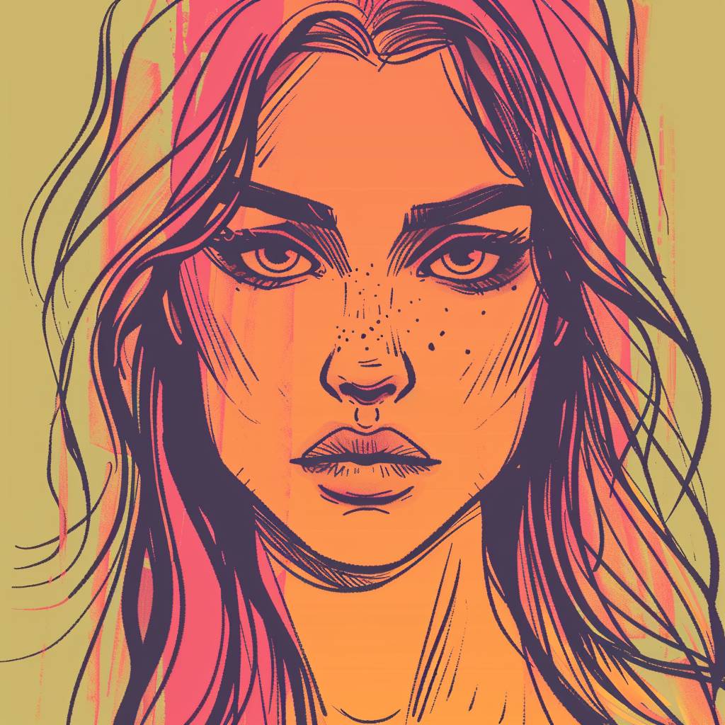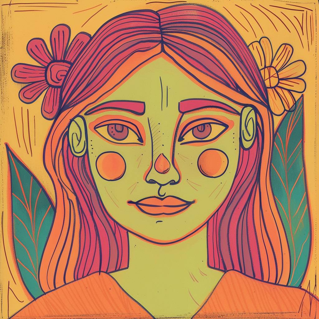 肖像、油彩、一人の女性があなたの目を真っ直ぐに見つめ、髪は小さな茶色と黄色の鳥から成り、衣装を着ています。細い美しい顔、黄色と薄い青の背景にいくつかの要素があり、手描きのイラスト、大きなブラシストローク、広いブラシストローク、マチェイ・クチャラのスタイルで