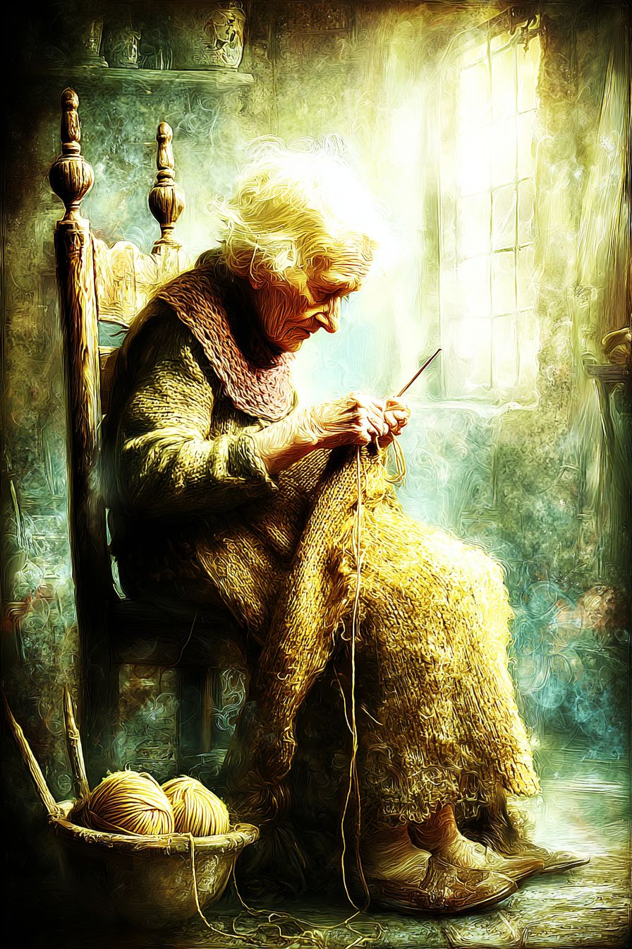 賢いおばあちゃんが編み物をしている