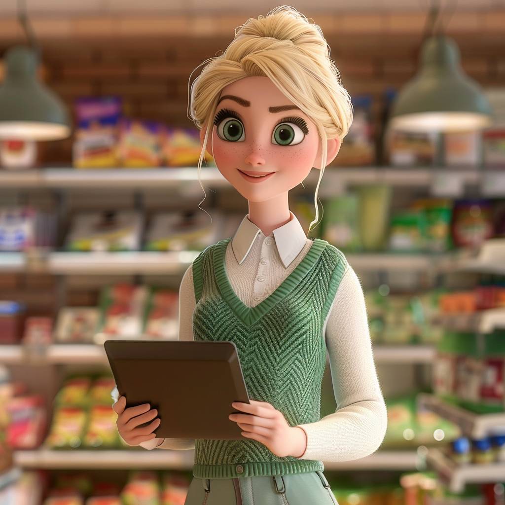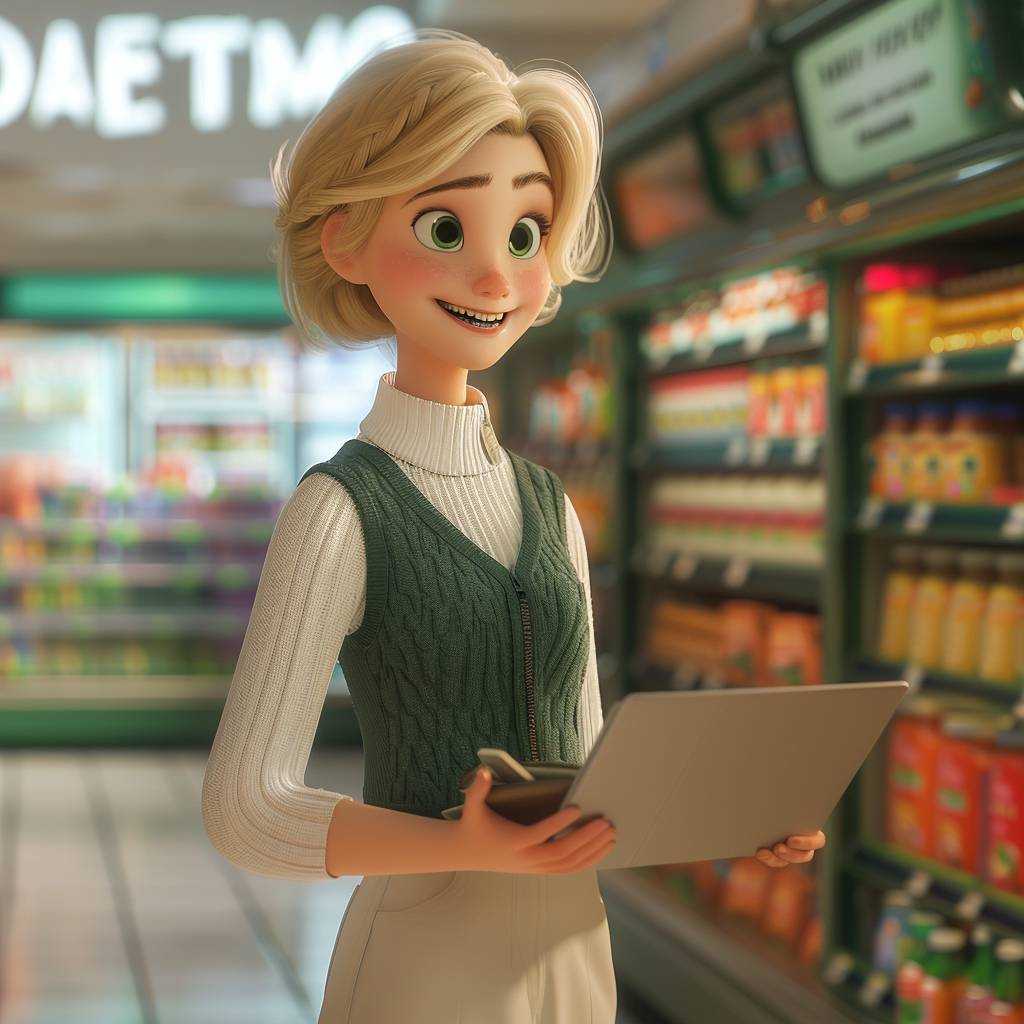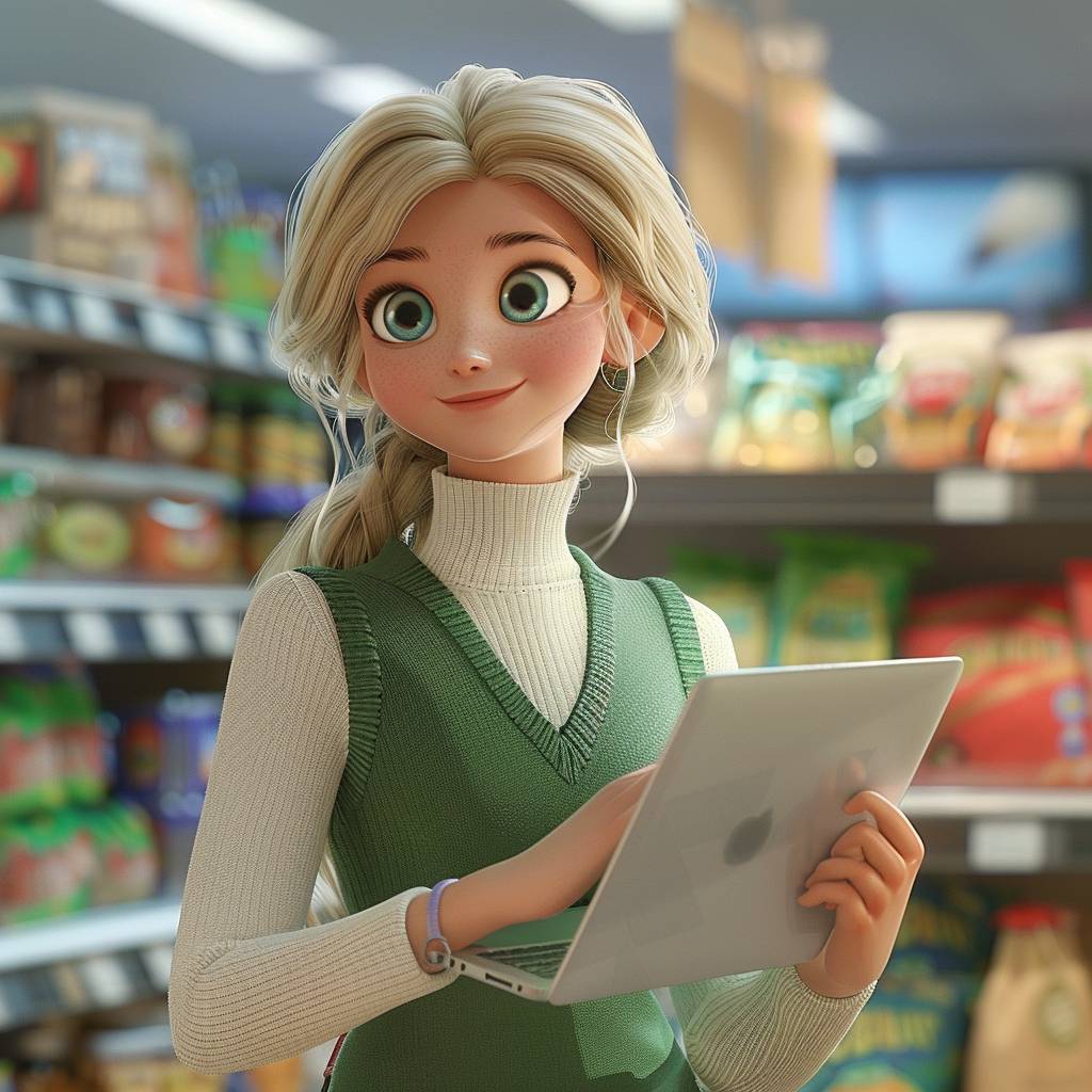 ピクサースタイルの女性が、白いセーターと緑のベストを着て、金髪の髪を持っています。彼女は半分横向きに立ち、手に開いたノートパソコンを持ち、カメラを真っ直ぐ見つめ、微笑んでいます。背景はスーパーマーケットで、彼女の表情は自信と落ち着きを伝え、ピクサーのスタイルを表現しています。