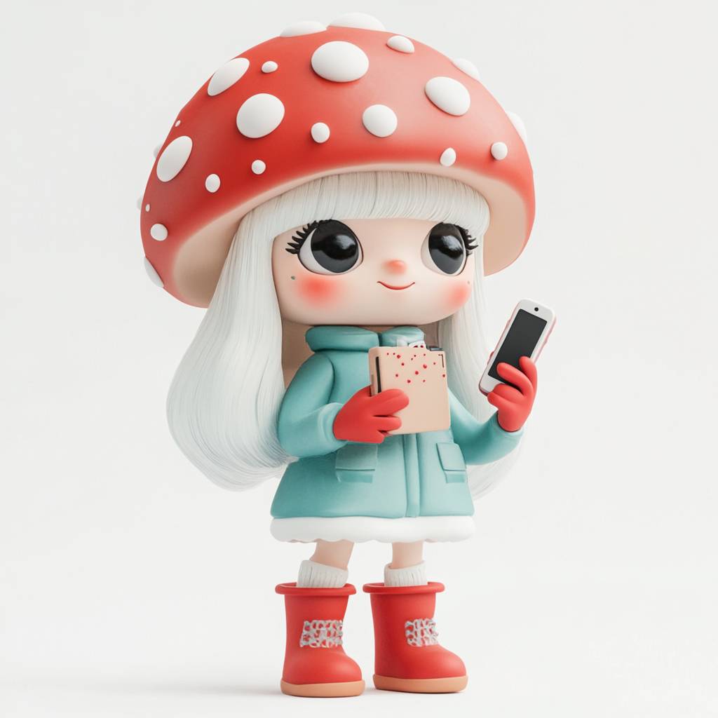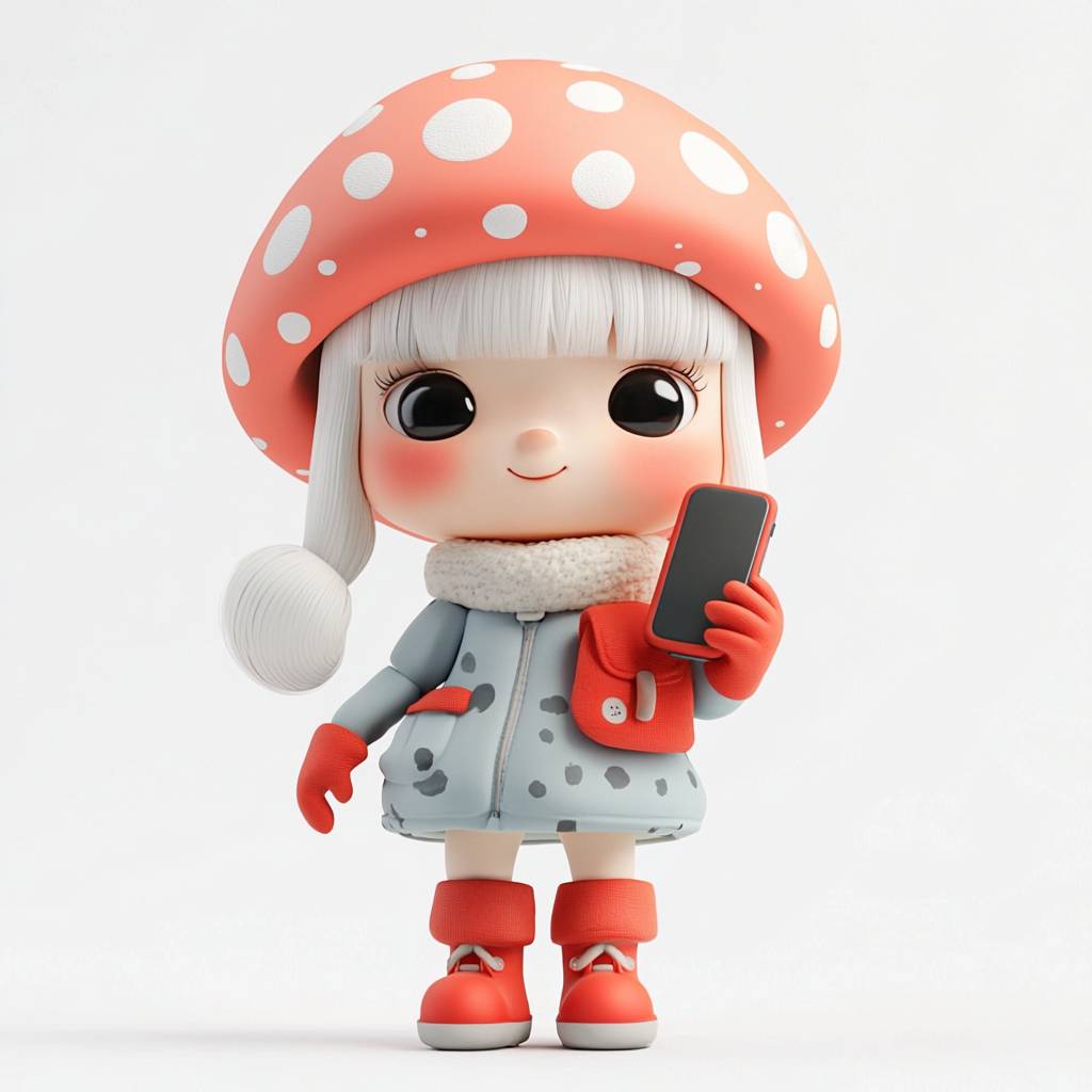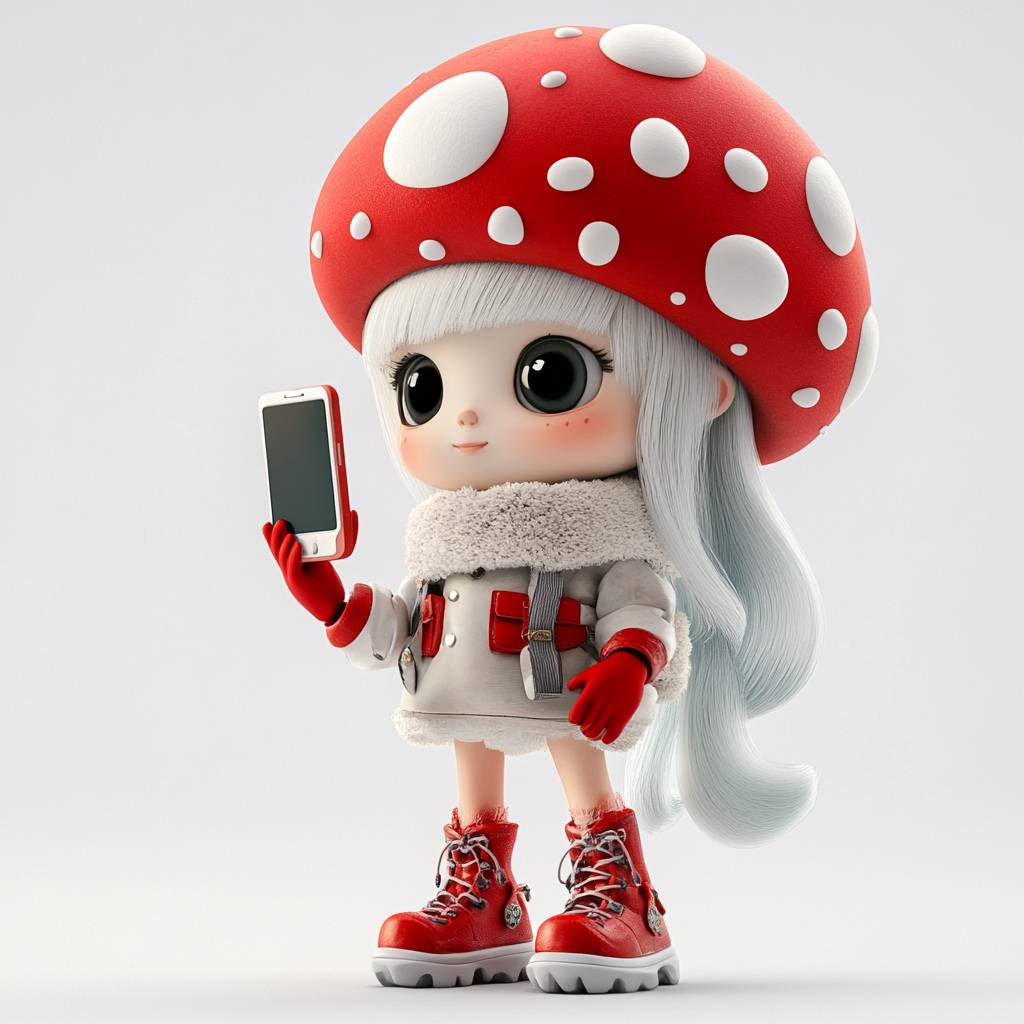 Cute cartoon mushroom doll, Q version style, bright colors, powder blue tone. Black eyes, white hair, small dots on the hat, blush on the long nose, holding a mobile phone in one hand, the character wears cute red boots and gloves, the overall tone is soft, 3D rendering, c4d, blind box design, white background --v 6.1
