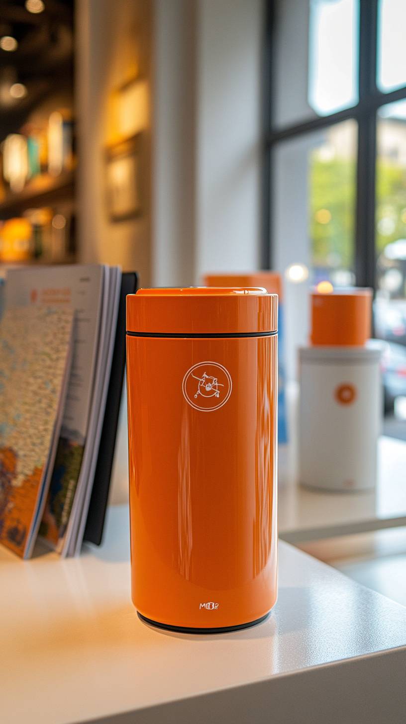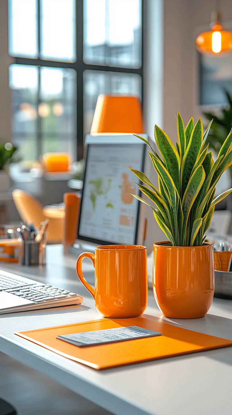 A bright and modern office designed for a travel agency, featuring a color scheme of white and vibrant orange. In the foreground, there is a close-up of a sleek white desk, adorned with a few orange accents such as a desk lamp, stationery holder, and a coffee mug. The desk is organized and inviting, with a computer, a world map, and a few travel brochures neatly arranged. In the background, the office has large windows letting in plenty of natural light, white walls, and additional orange decor elements, creating an energetic and welcoming atmosphere perfect for inspiring travel plans. --chaos 30 --ar 9:16 --stylize 750 --v 6.1