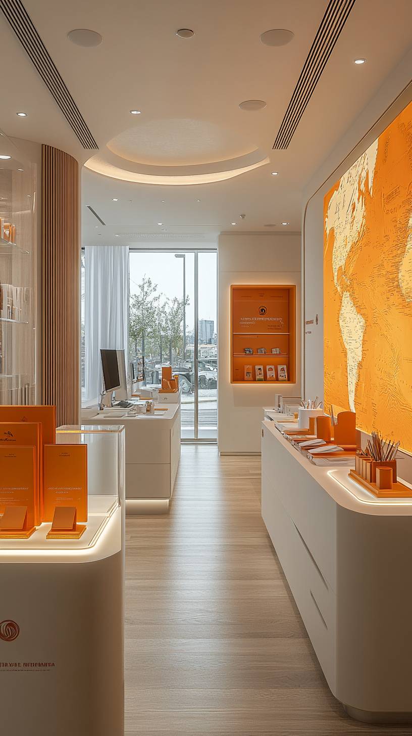 現代的な旅行代理店のオフィス、白とオレンジの色調で明るく快適。
