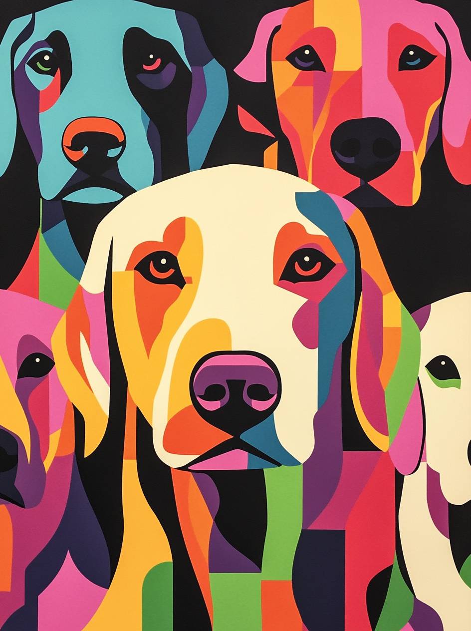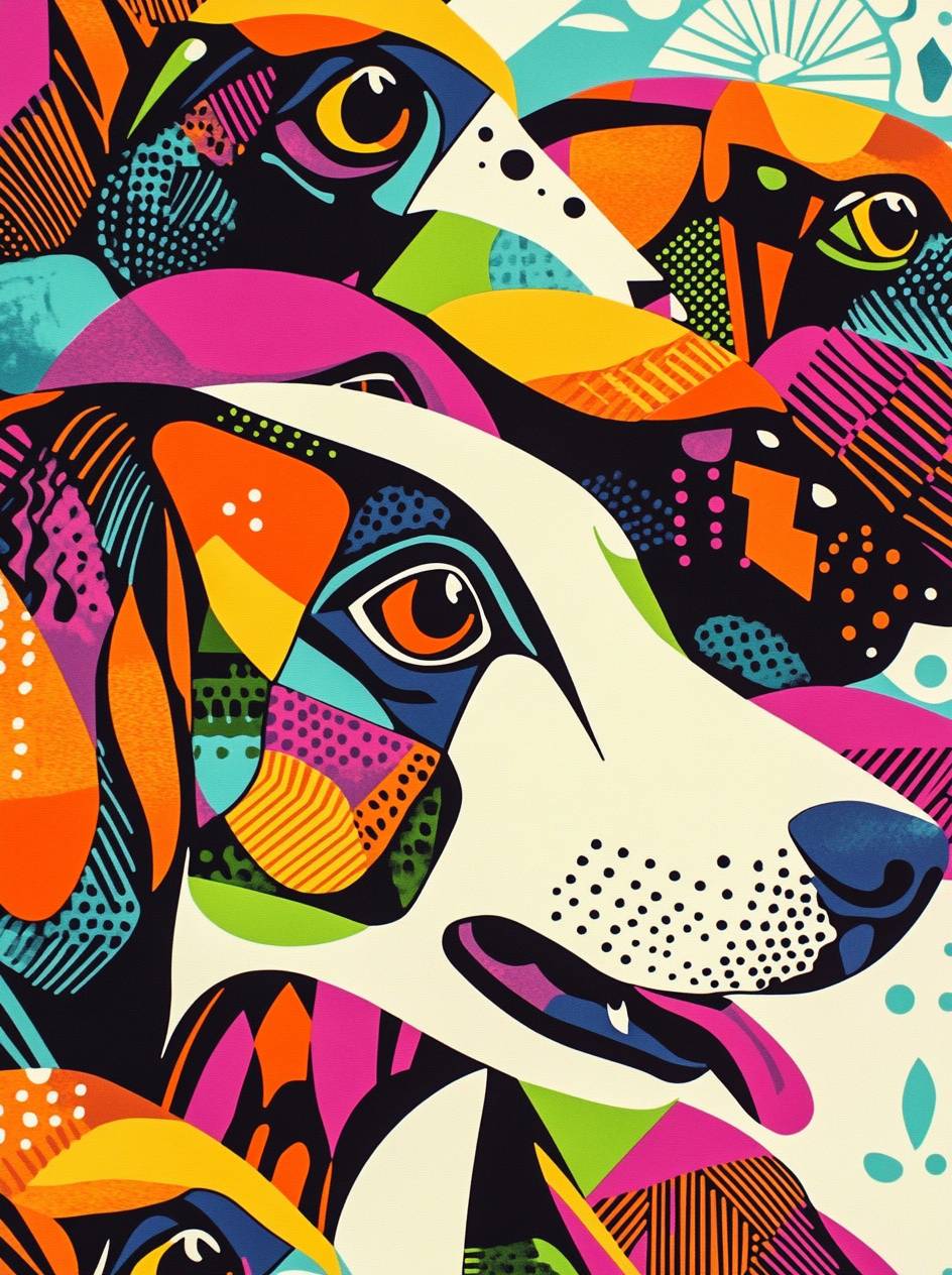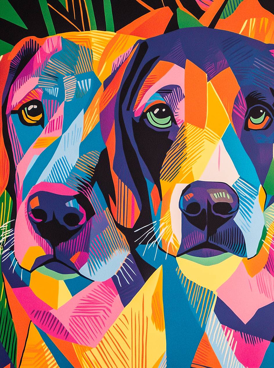 Vibrant geometric labrador dogs patterns on paper, showcasing vibrant color schemes and sharp lines. The design incorporates bright colors like orange, pink, green, blue, yellow, red, purple, white, black, in the style of linocut technique. --ar 38:51 --v 6.1