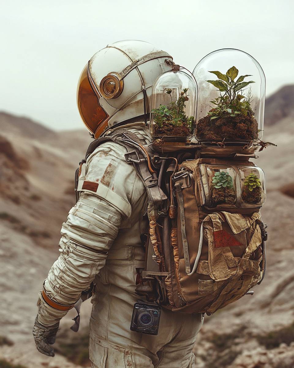 カメラに背を向けた宇宙飛行士の写真です。彼は年月の経過とともに宇宙空間での使用によりバックパックになったビンテージの宇宙服とヘルメットを着ています。その上には植物と昆虫が入った小さなガラスのテラリウムが2つ載っています。背景には荒れた砂漠の風景が広がっています。雰囲気は、宇宙空間での長年の使用に基づいたレトロフューチャリスティックなSFスタイルです。