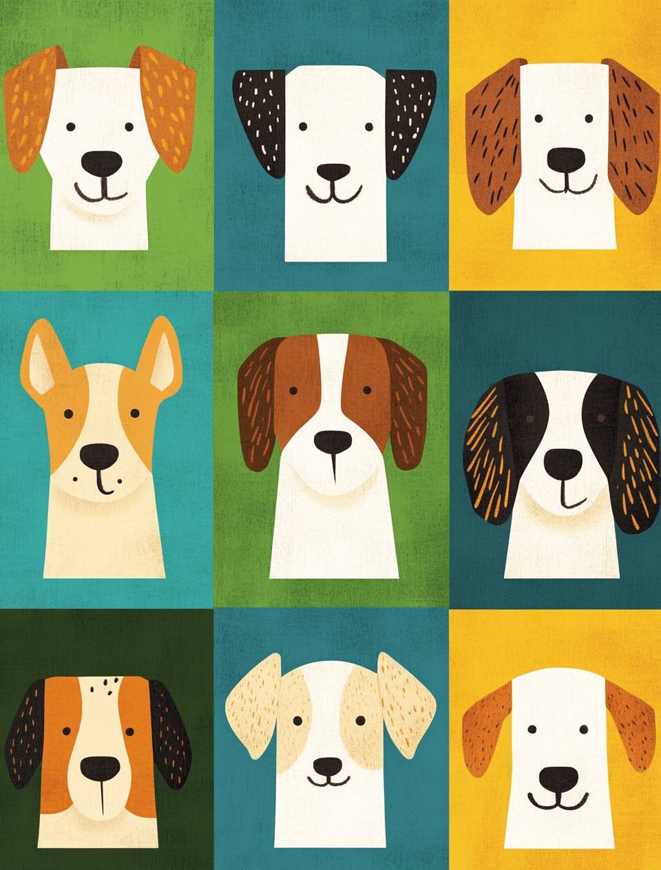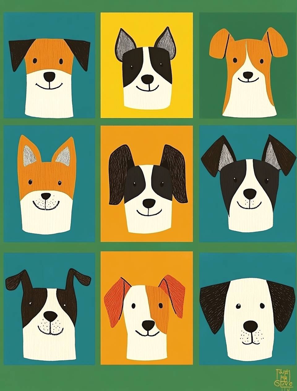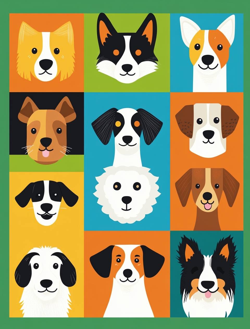 A set of cute cartoon dog faces in the style of minimalist illustrator Jon Klassen, with bold lines and simple shapes. The background is bright green, blue or yellow squares, arranged in a grid pattern. Each face has different hair patterns and colors, such as white fur on black ears for corgis, brown woolen coats for sheep dogs, etc., with simple eyes and expressive mouth expressions. --ar 97:128 --v 6.1