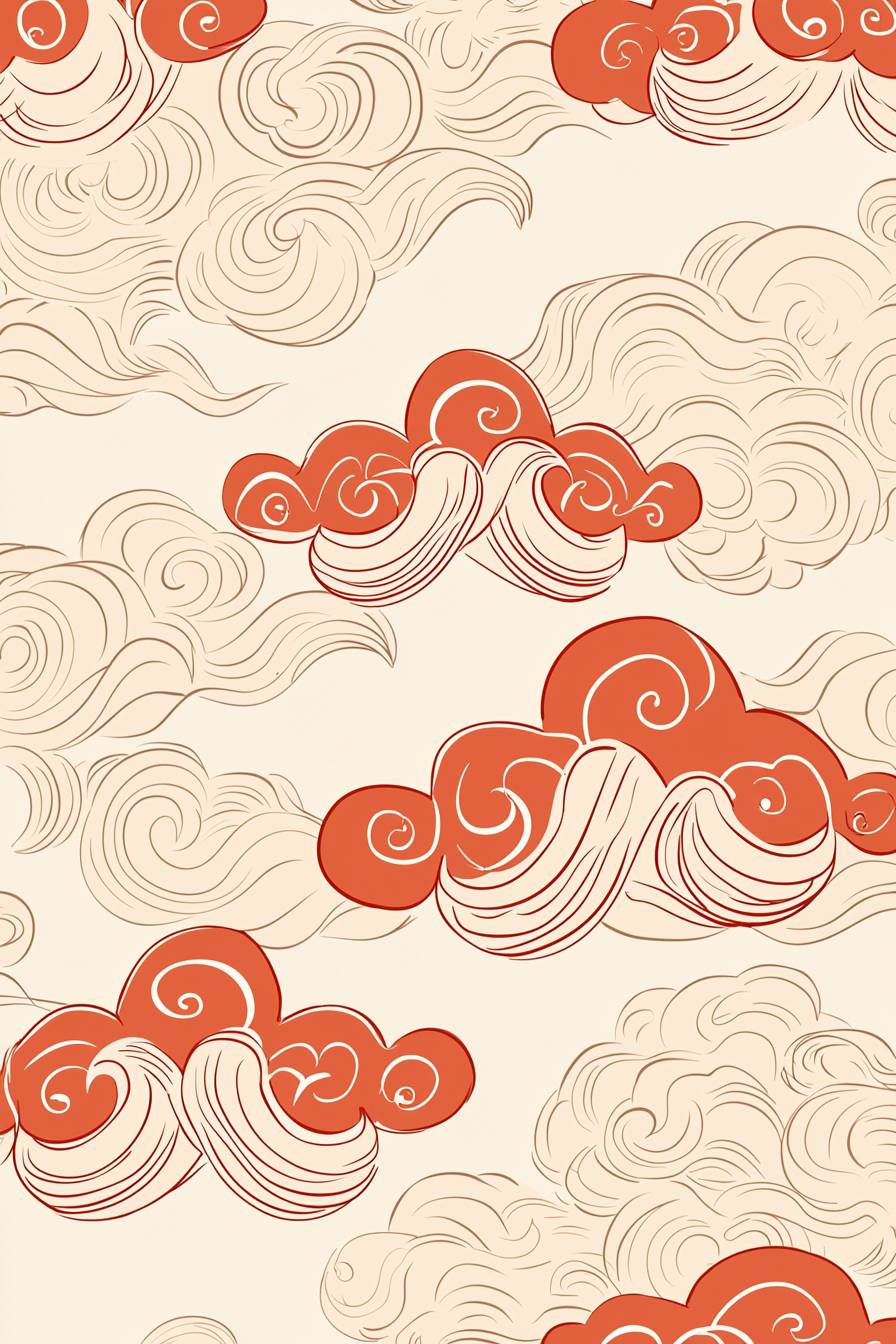 中国の雲模様、シンプルな線、ベージュの背景、赤い雲、フラットスタイル、中国の伝統的な要素を取り入れ、吉祥で平和な雰囲気を醸し出す。構図は対称的で、中央に二次元の雲があり、全体的な統一感を生み出している。柔らかな照明が温かい色調を作り出す。このデザインは中国の幸運を象徴している。スタイルは伝統的な中国のアートスタイル。