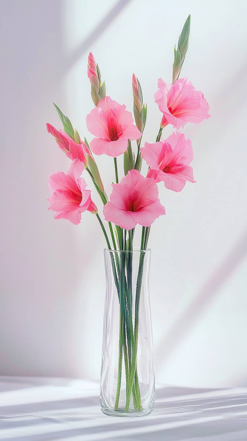 gladiolus,Placed in a transparent glass vase, advertising photography, realistic, natural light,8k, --ar 9:16 --v 6.1