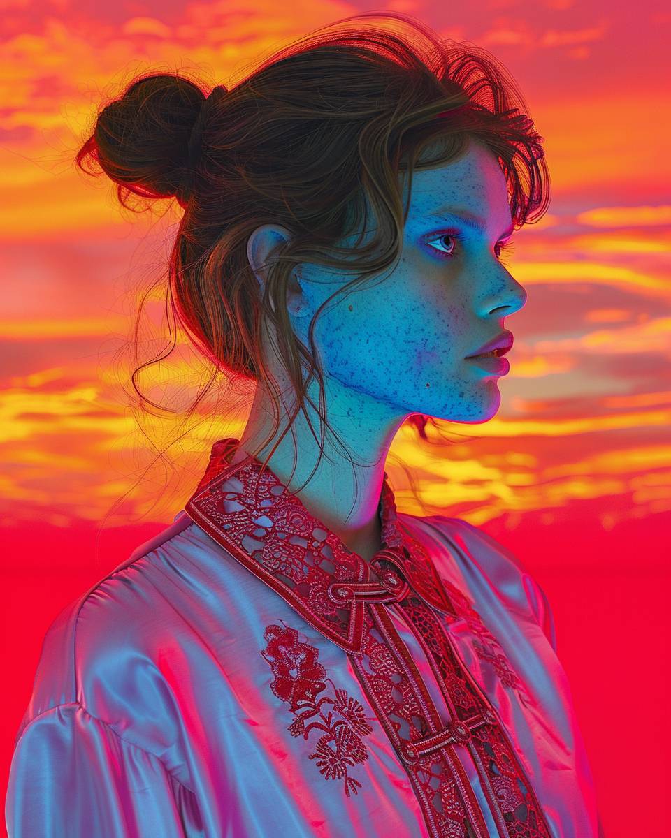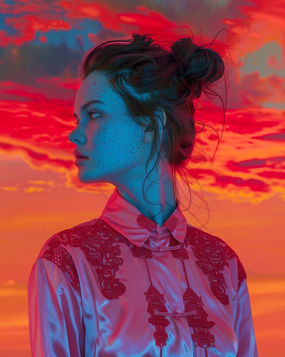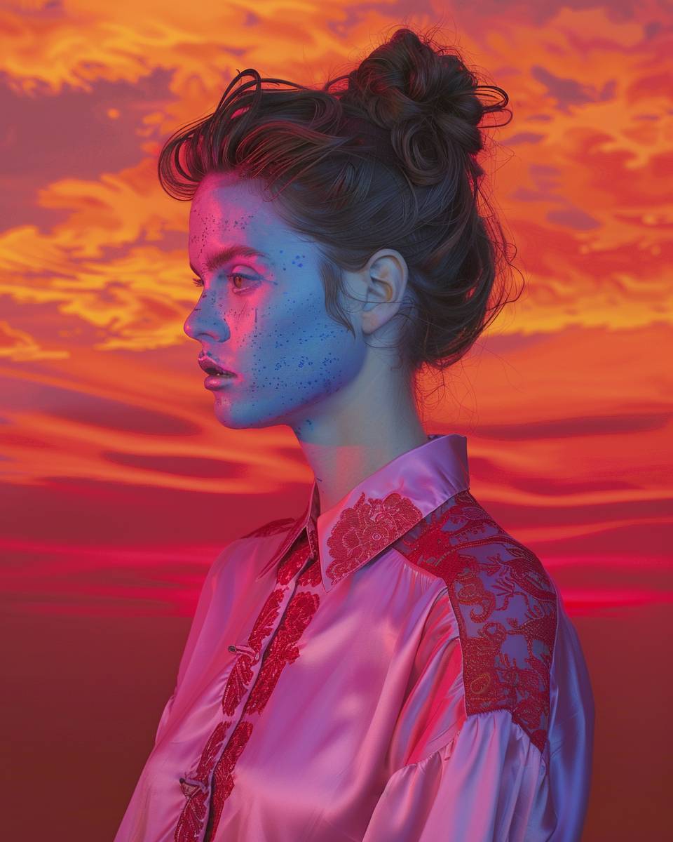 青い肌の茶色の髪の女性が、髪をお団子にまとめて、赤い中国刺繍が施されたオーバーサイズのネオンピンクのシルクシャツを着て、サイドから見た姿、鮮やかな赤・オレンジ・ピンクの夕焼け空を背景に、超現実主義のスタイルで、ハイパーディテール。