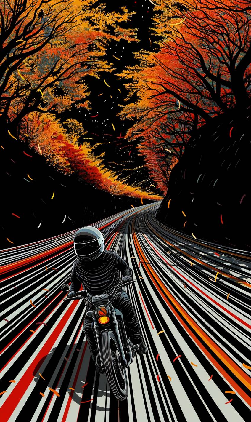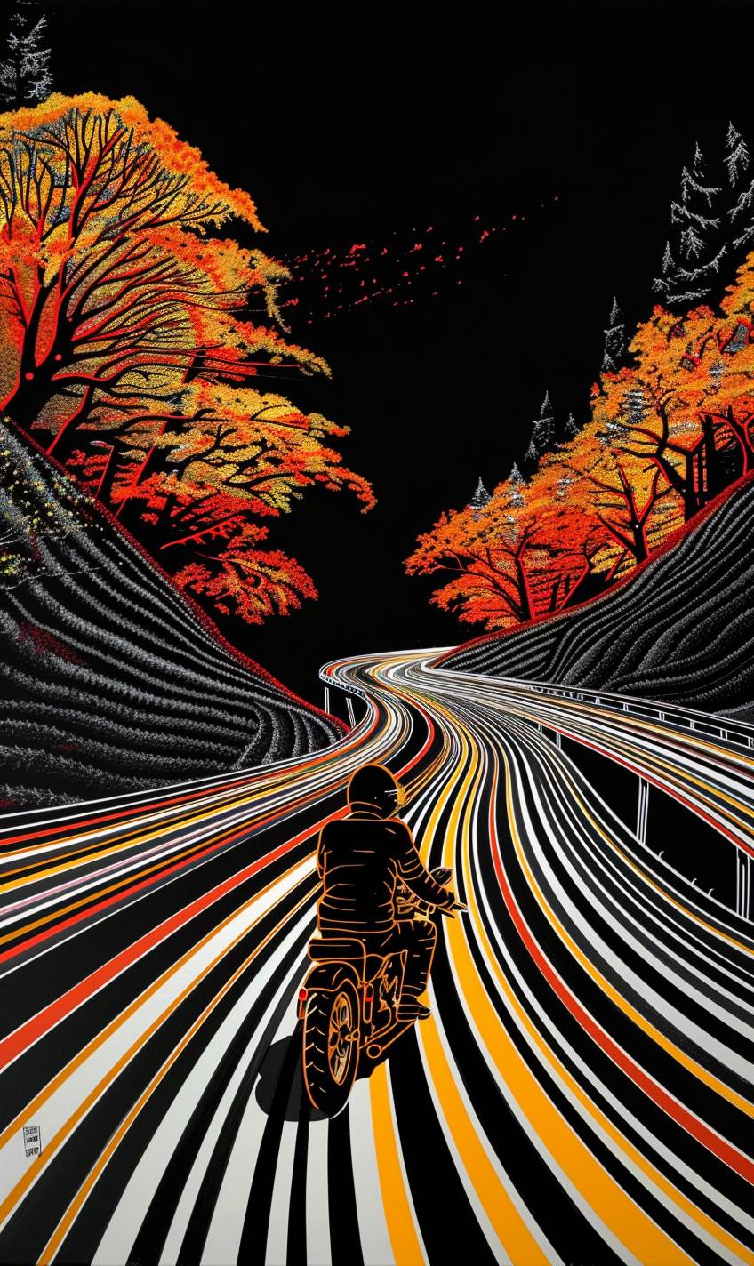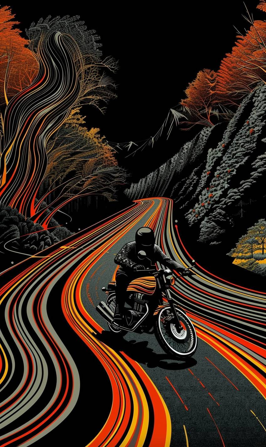 Haru is riding a motorcycle on a scenic road. --ar 3:5 --sref 40 --v 6.0