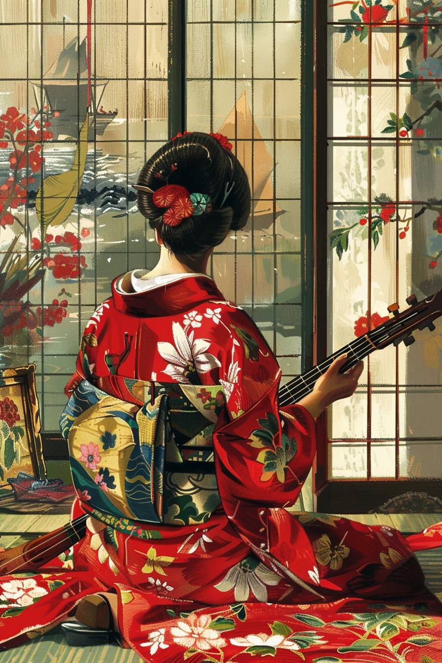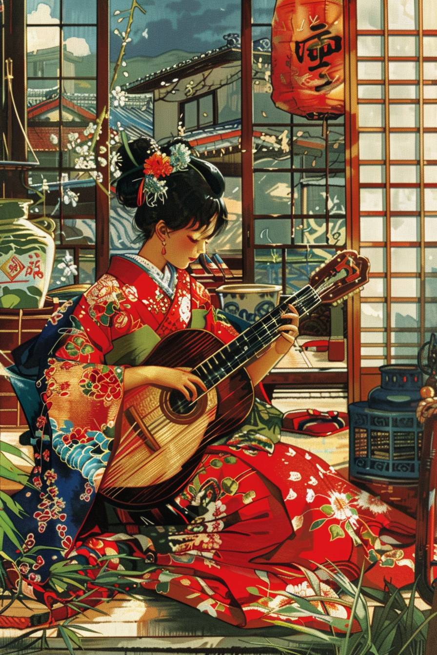 Akane is playing the shamisen in a traditional room. --ar 2:3 --sref 94 --v 6.0