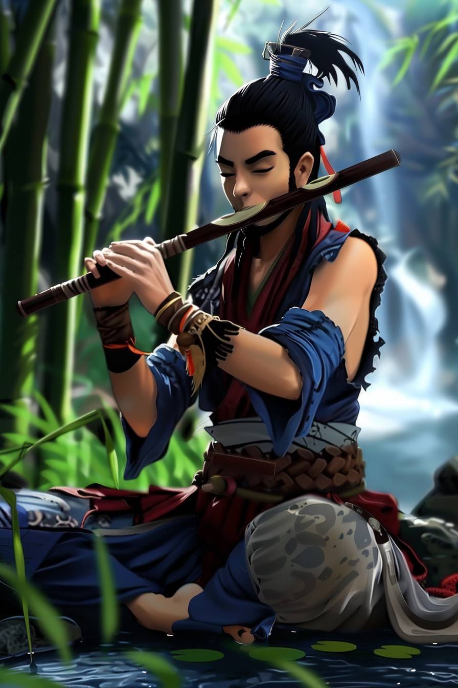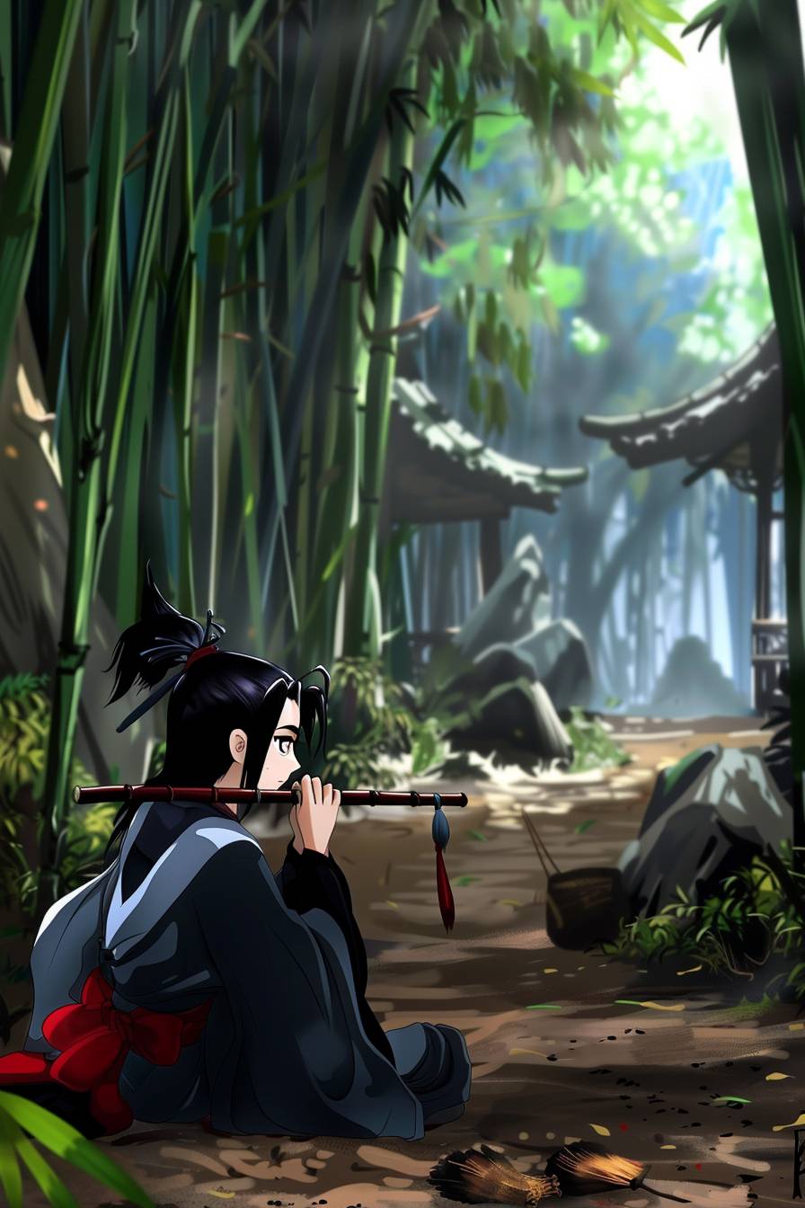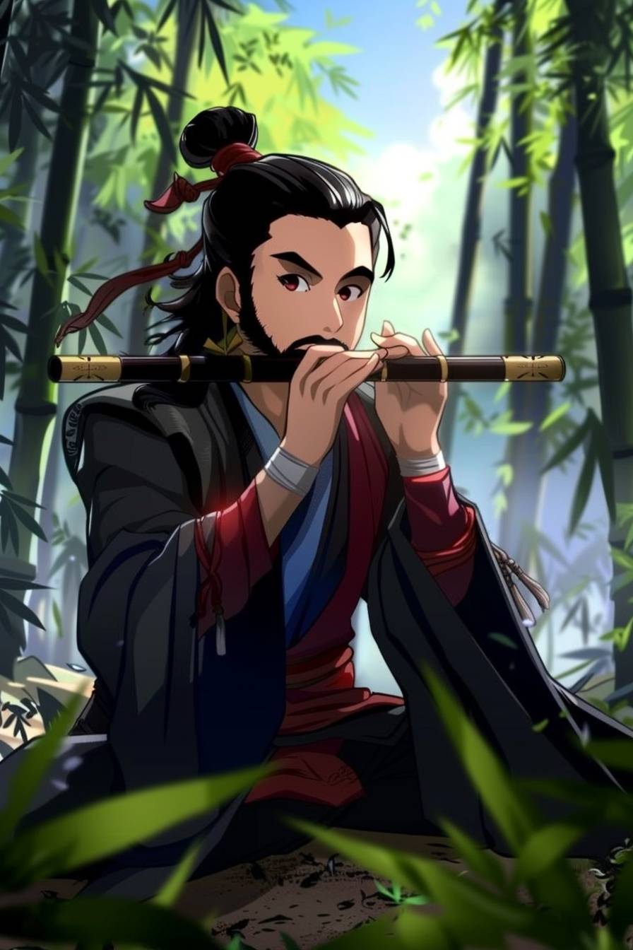 Taro is playing the flute in a bamboo grove. --ar 2:3 --sref 187 --v 6.0