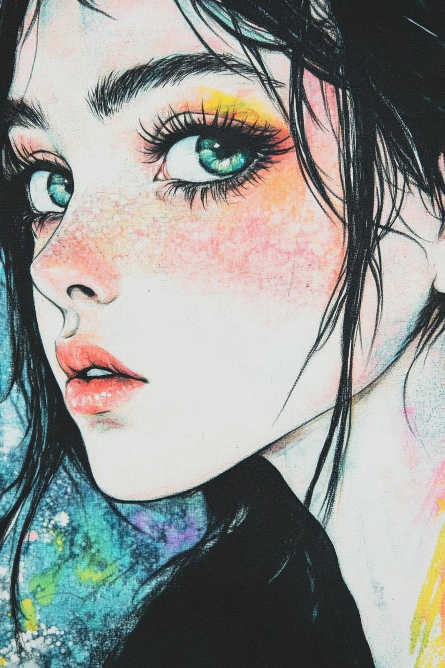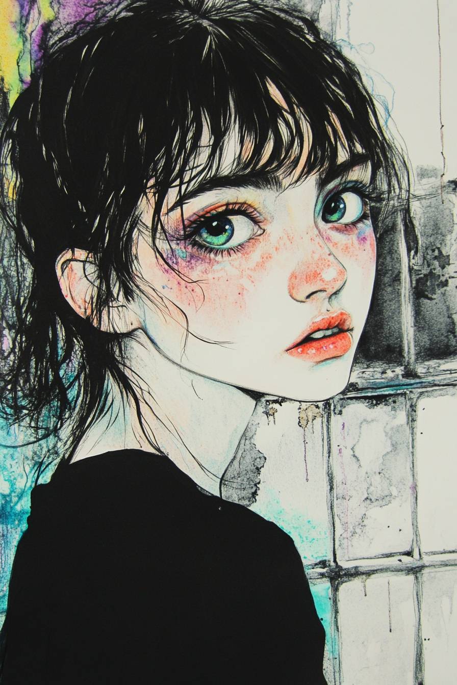 A woman with almond-shaped eyes is staring thoughtfully. --ar 2:3 --sref 1782366353 --v 6.1