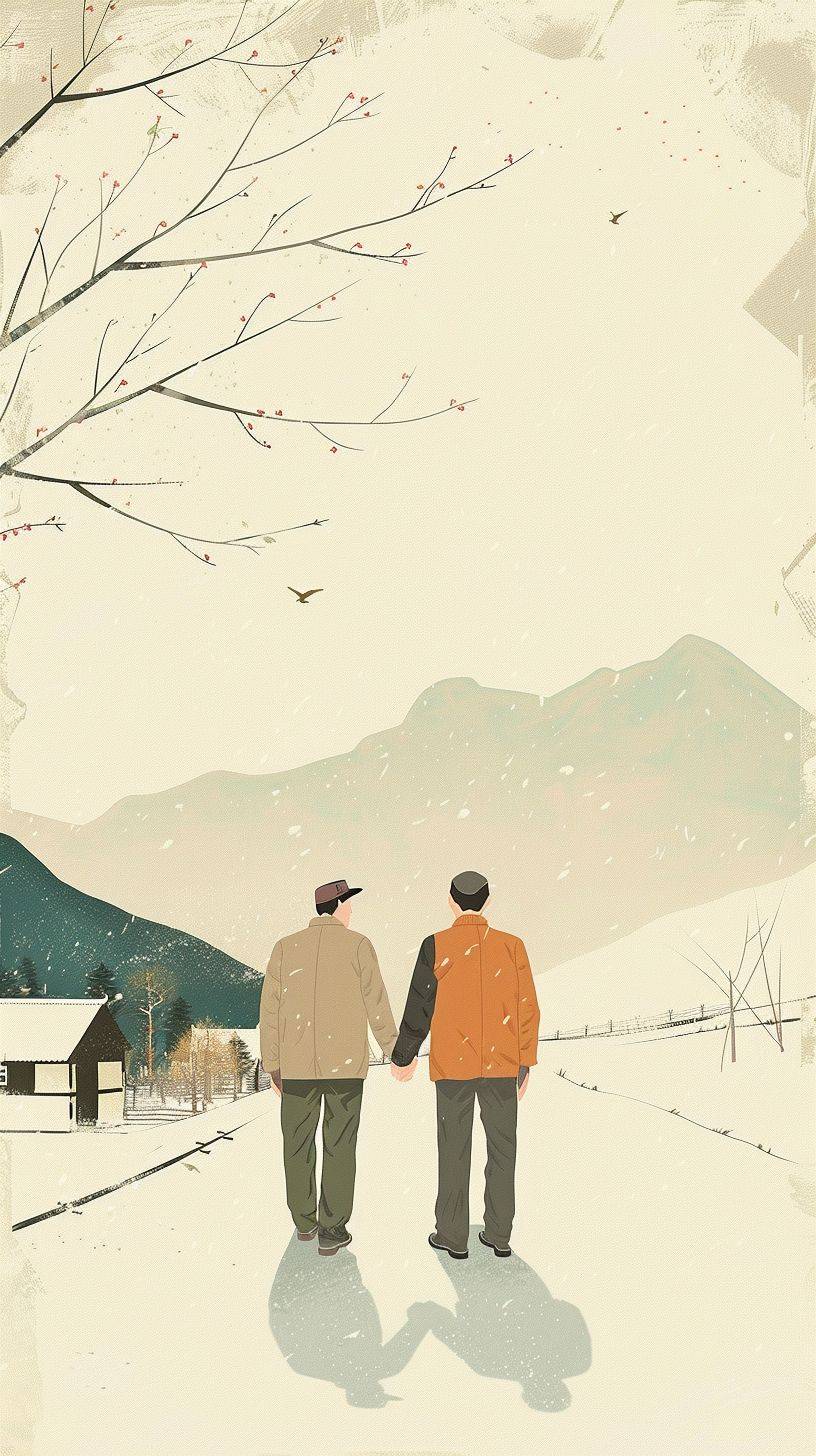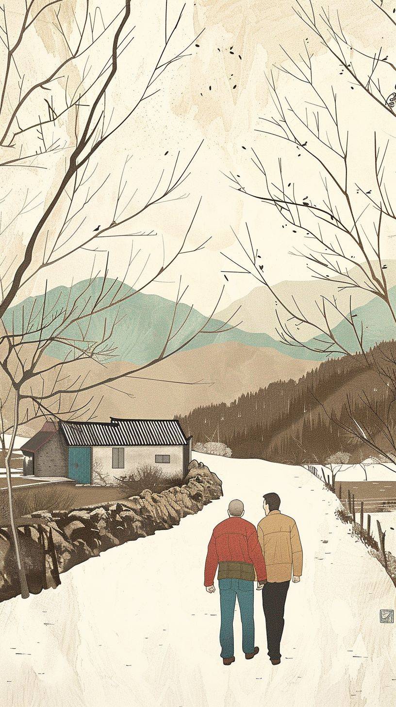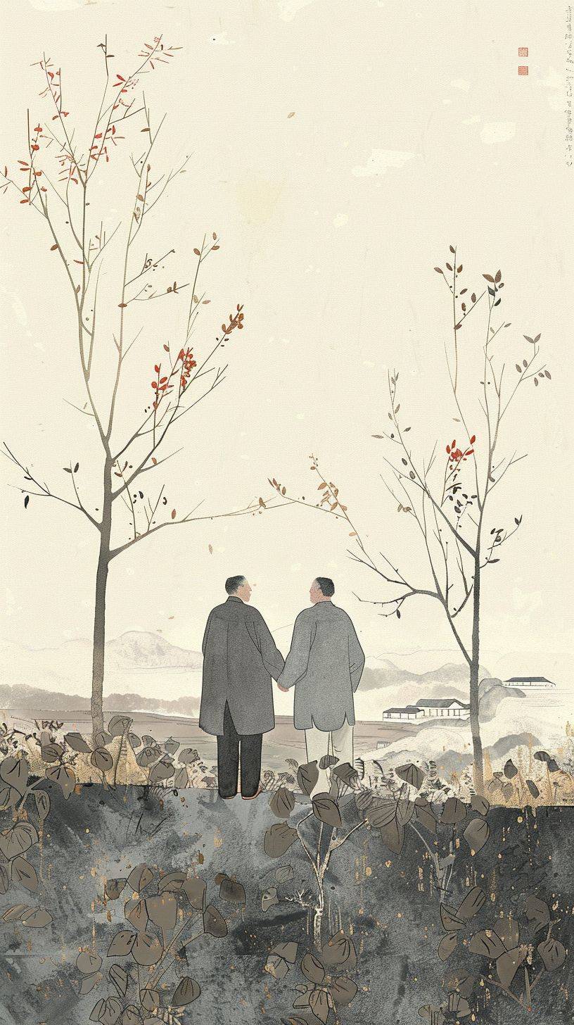 two Chinese men in a Chinese farm holding hands by Alessandro Gottardo --ar 9:16 --stylize 50