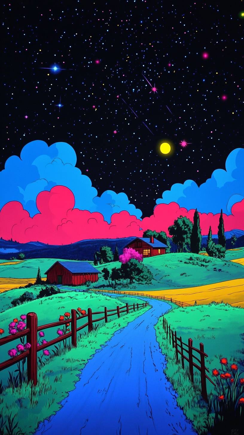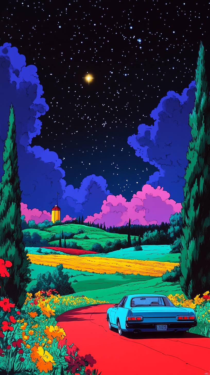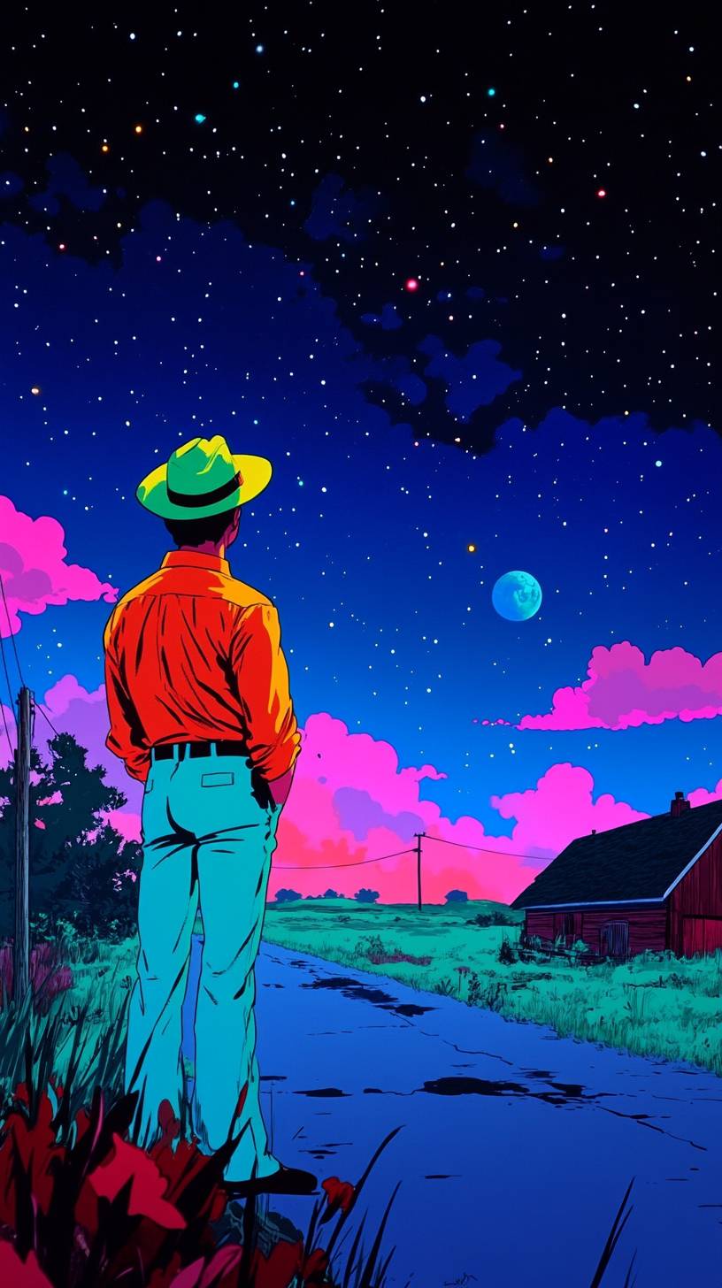 Clark Kent from the comics standing near his car looking up and thinking of his home planet. farm road. night sky. space. stars. peacful. painting. --sref 924748692 --sw 500 --stylize 1000 --v 6.1 --ar 9:16