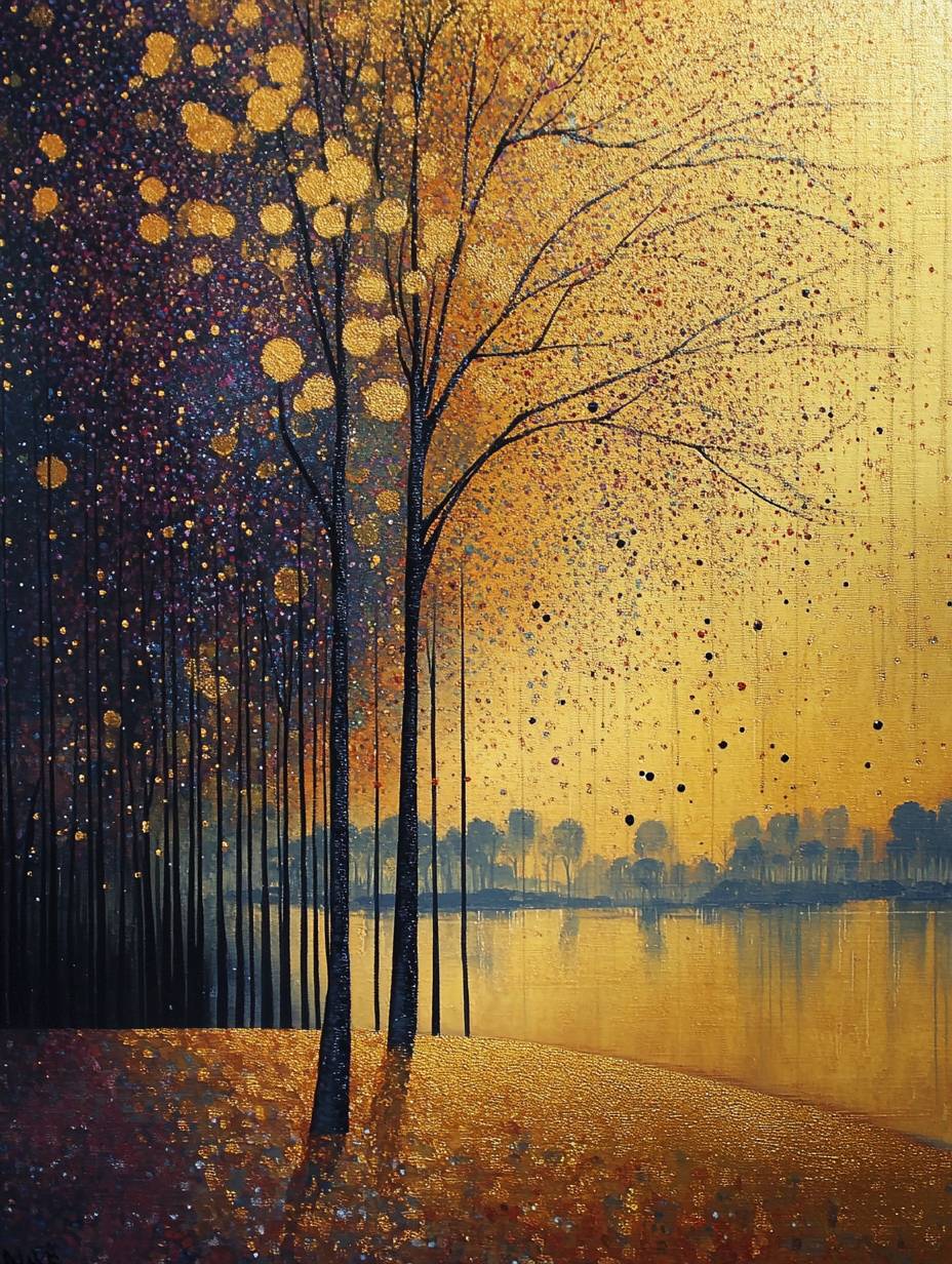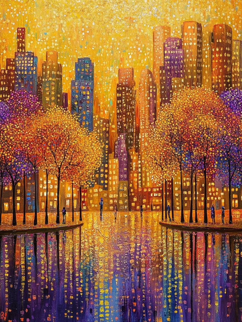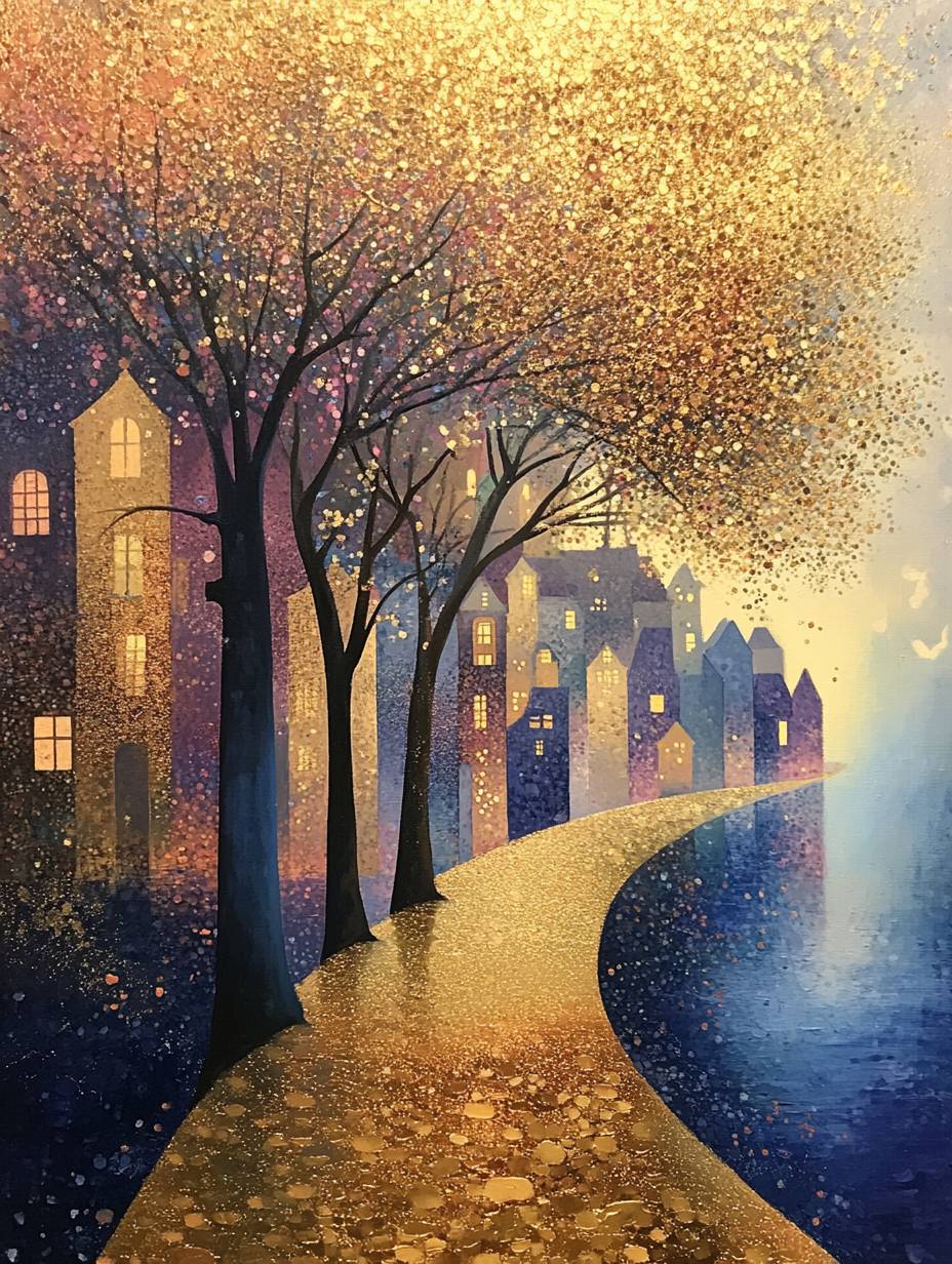 油絵、作:Ton Dubbeldam、上部、金箔を使用し、輝く、きらびやかな、夢のようなシーンを表現し、幻想的な魔法の雰囲気、きらきらとした夢の風景、精緻なディテール、点描技法、都市、風景、可愛らしい、ムーディーな環境光、高品質、高解像度、8k