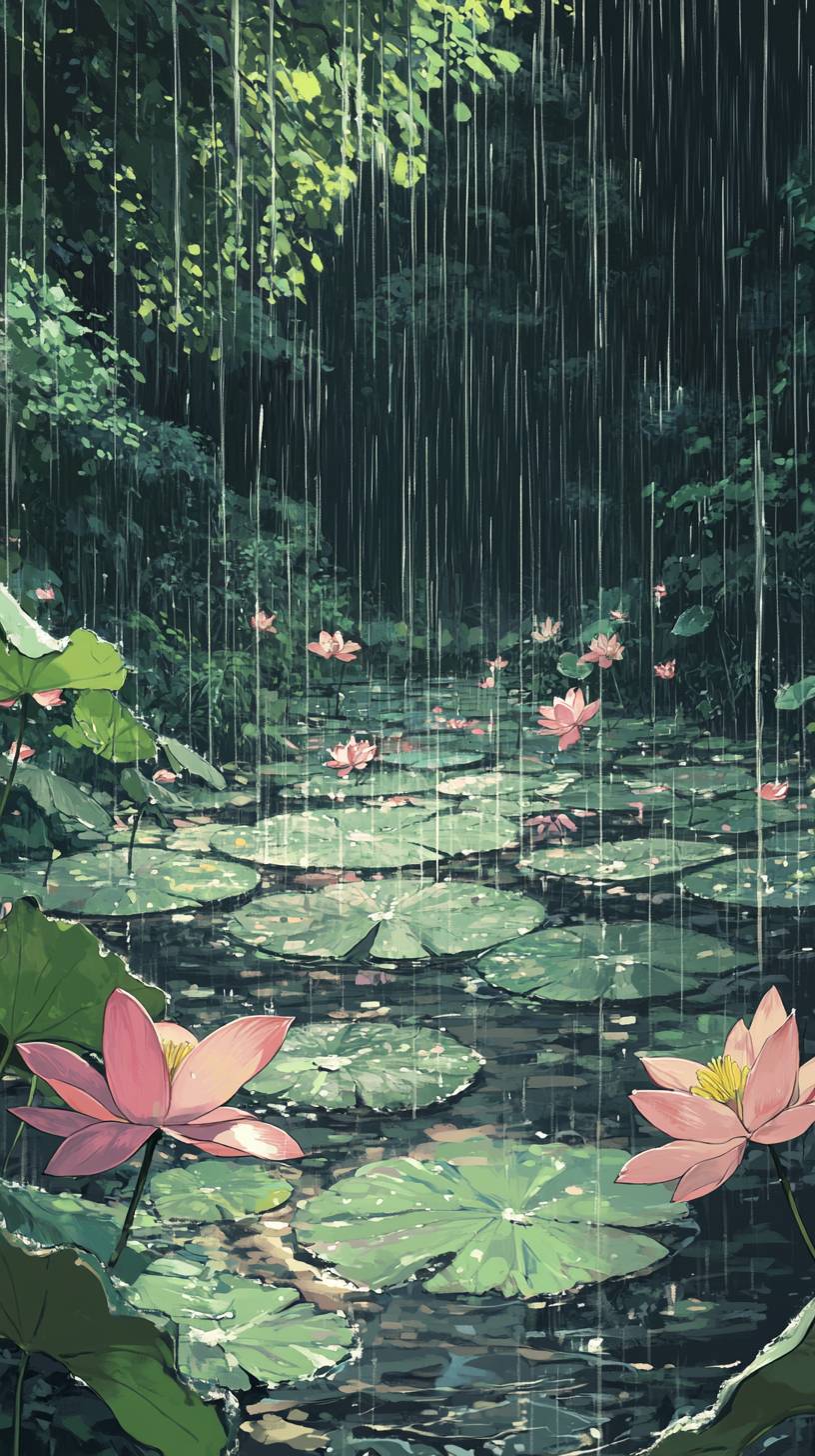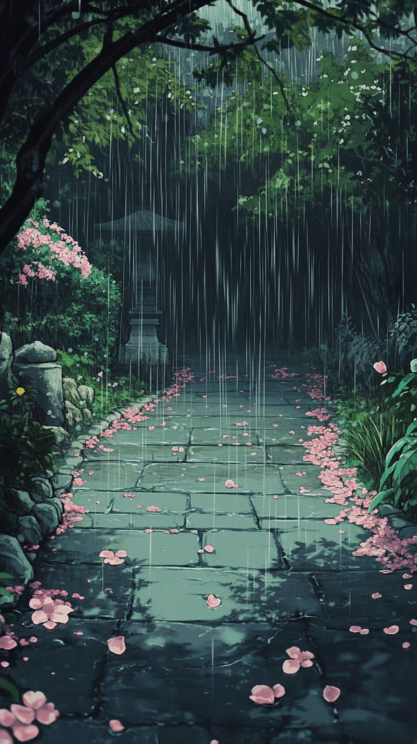 Garden in Rainstorm: An anime garden soaked in a heavy rainstorm, with large raindrops hitting the leaves and petals. The scene is dark, with a moody ambient atmosphere. The garden paths are slick with water, and puddles are forming. The art style is Ghibli-inspired, with intricate hand-drawn details. --ar 9:16 --v 6.1