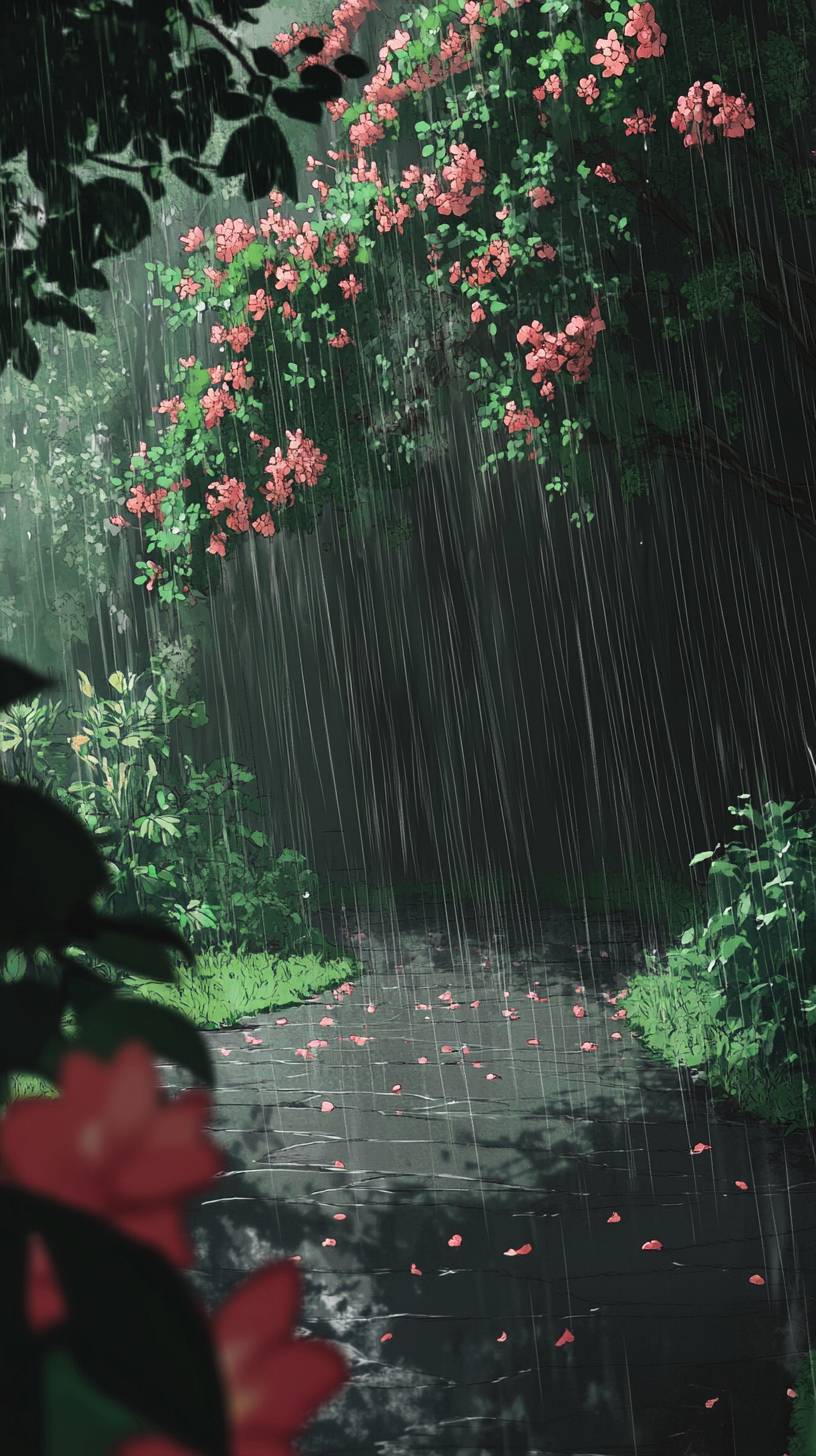嵐の中の庭:大雨に濡れたアニメ風の庭、大きな雨粒が葉や花びらを叩いています。シーンは暗く、ムーディな雰囲気です。庭の小道は水で滑りやすく、水たまりができています。アートスタイルはジブリに触発されたもので、繊細な手描きのディテールが特徴です。