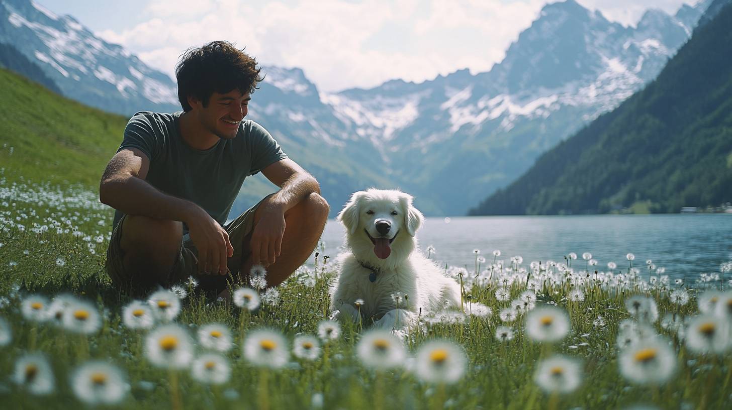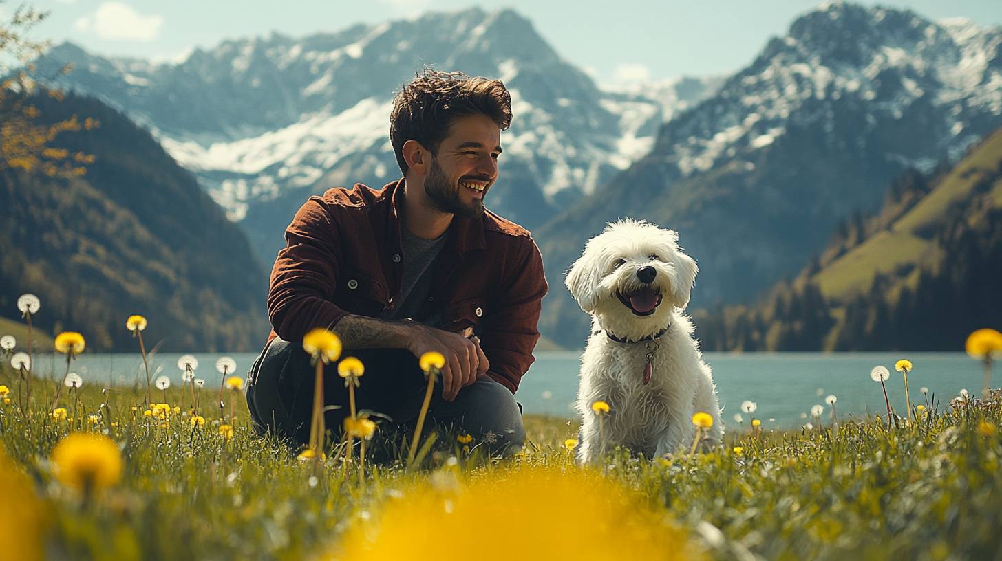 20代の男性が白い犬と一緒にSeealpseeのタンポポの中で幸せに過ごしています。