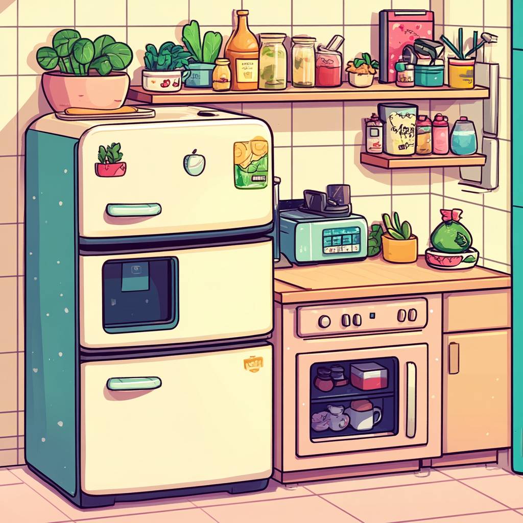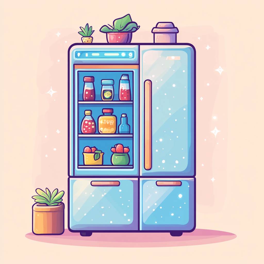 可愛いゲームインターフェースのイラストで、左側と右側のドアを持つダブルドアの冷蔵庫が描かれています。明るい色合いのスタイルで、カワイイアートのおもちゃにインスパイアされたイラストや、遊び心のあるカートゥーンシーン、児童書のイラストに基づいています。