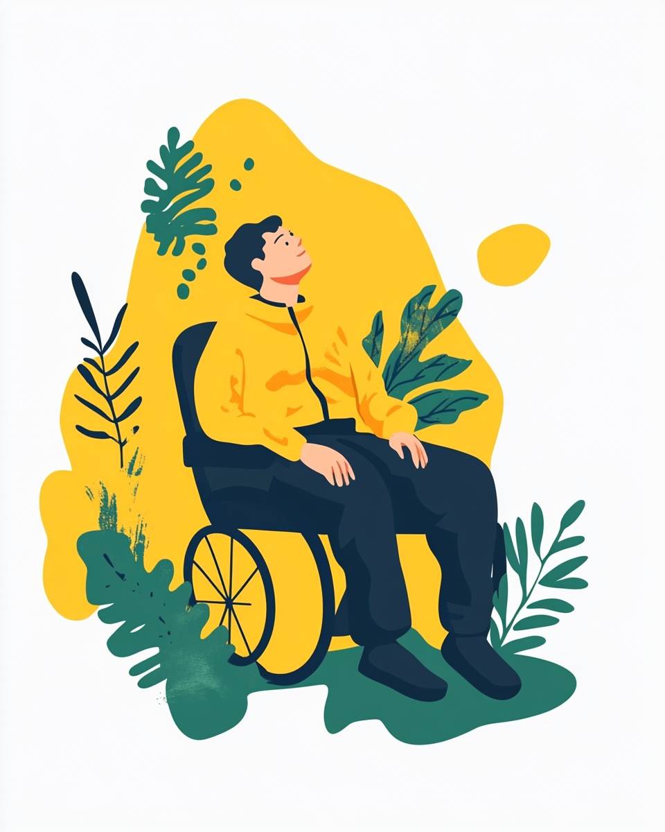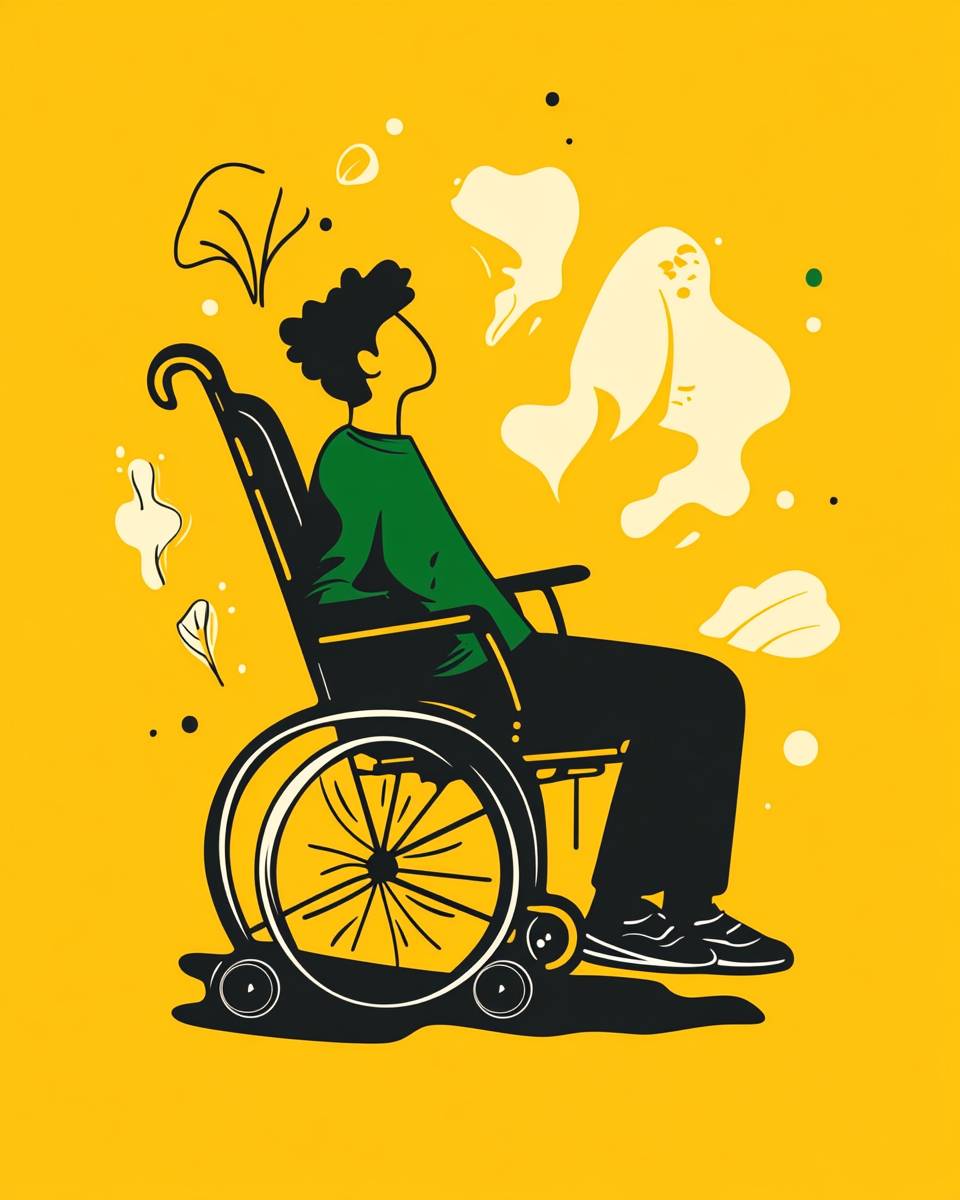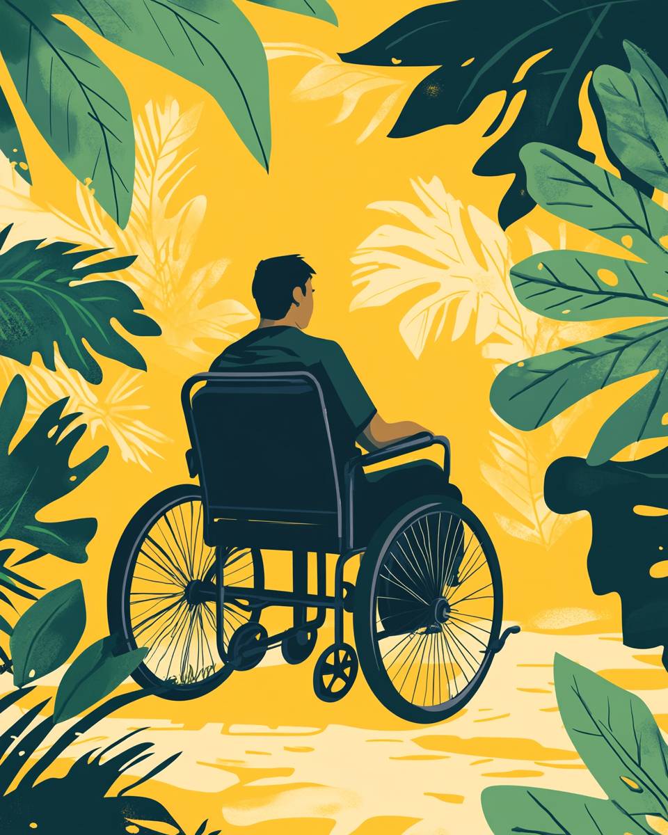 , Person with disabilities, 2d cartoon graphics, line drawing, simple bold colors, vector, abstract , clean, flat illustration, green and yellow color, --ar 4:5 --v 6.1