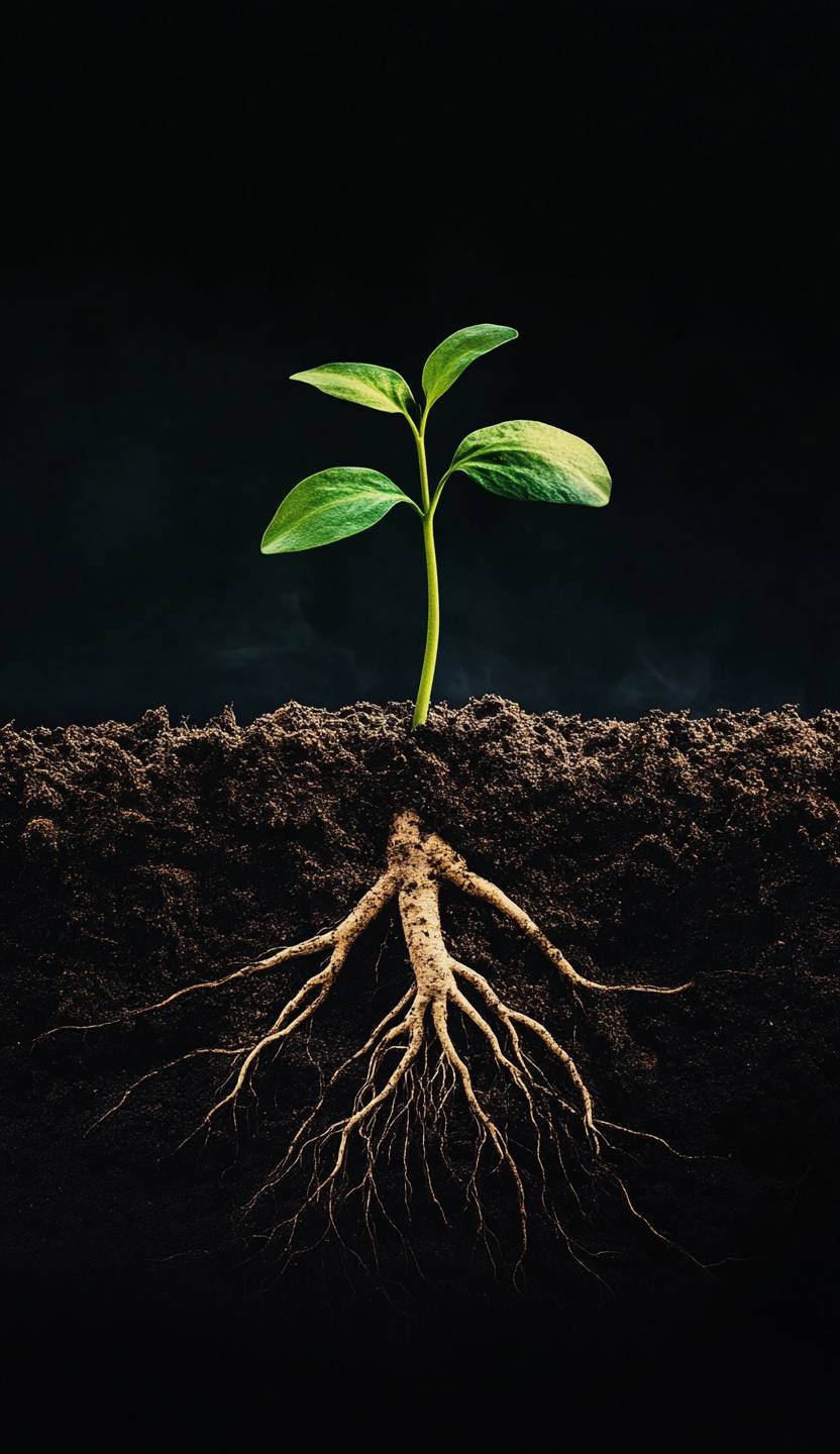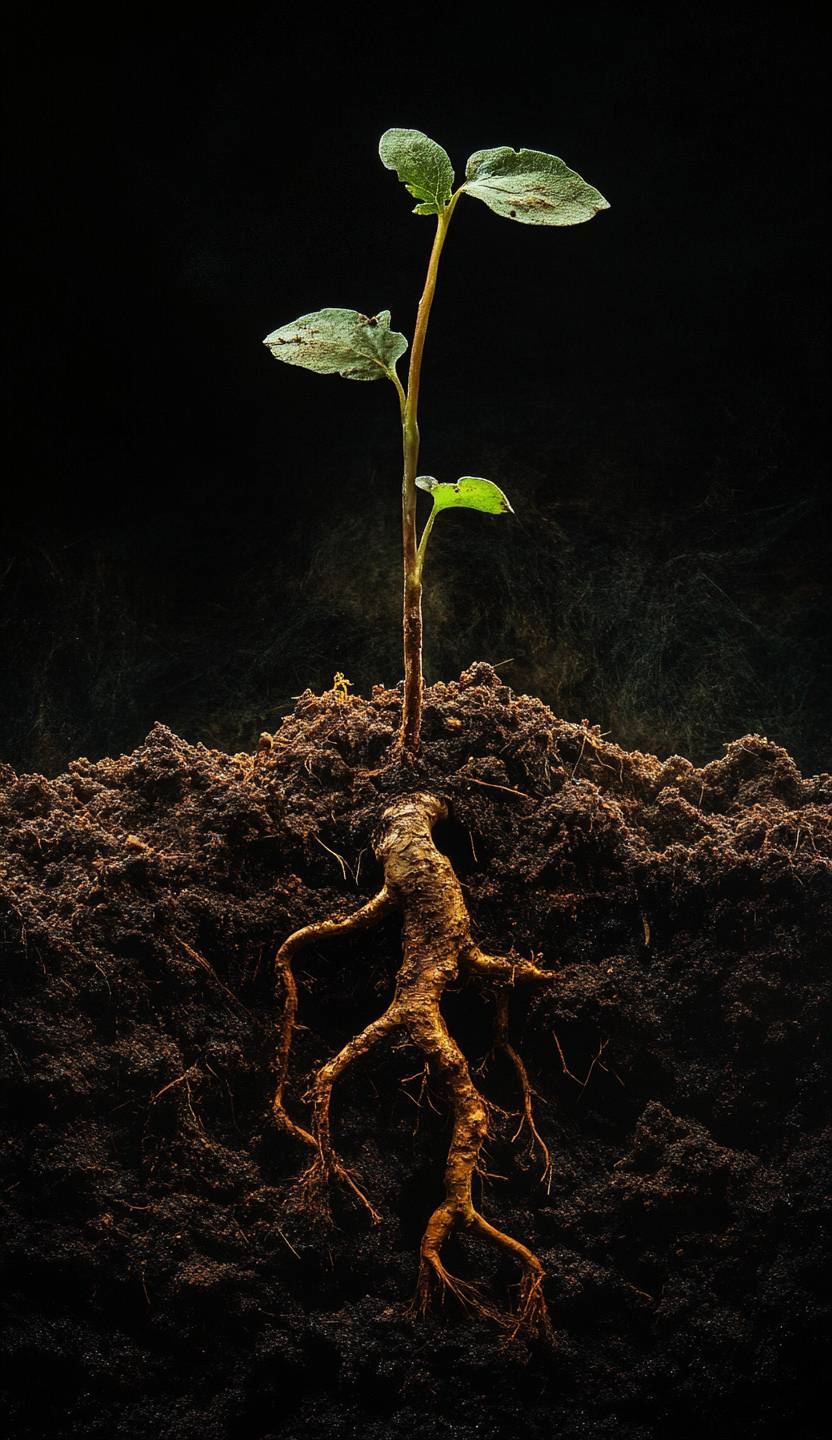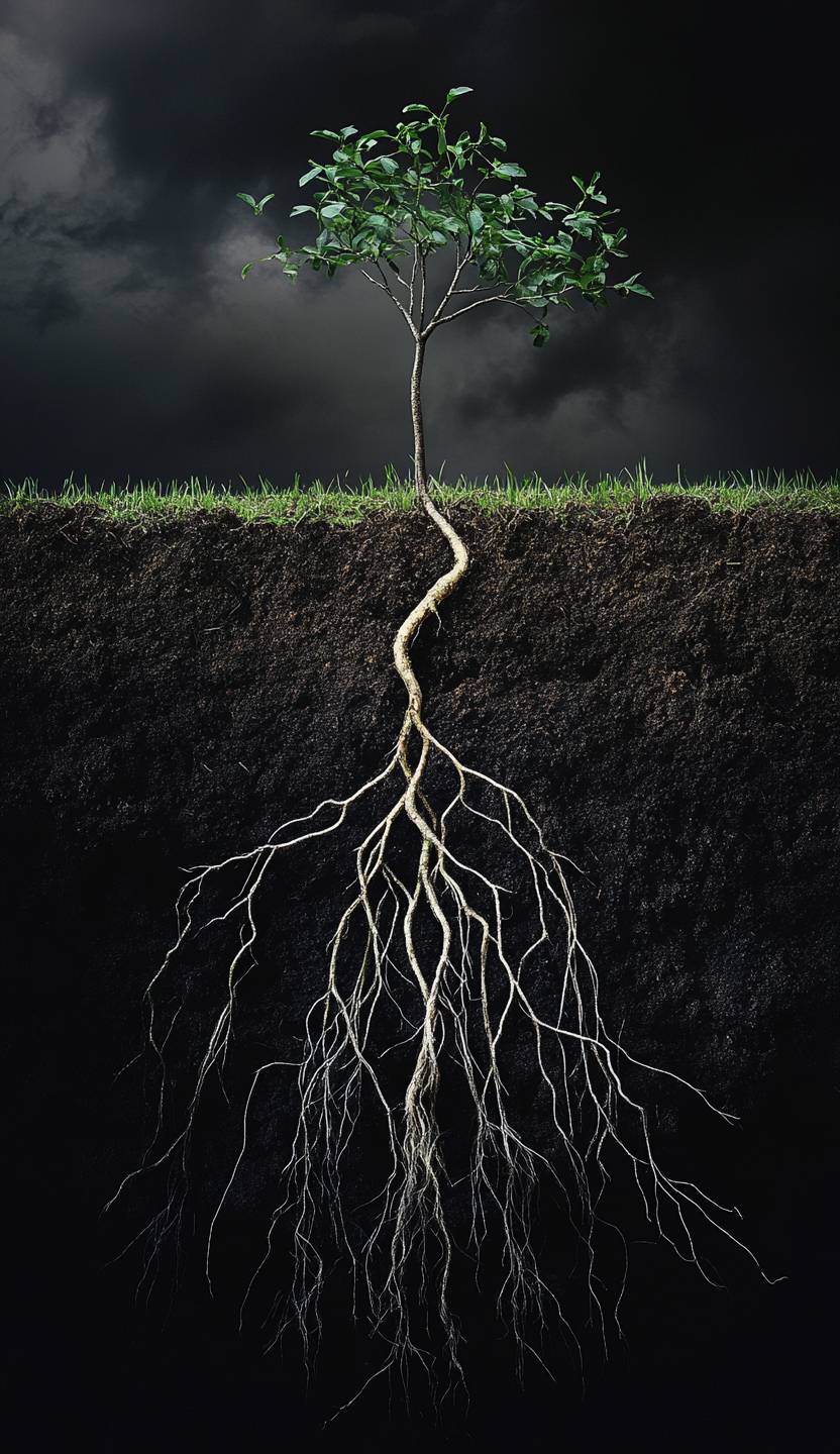 土壌から小さな植物の芽が出てきて、周囲は豊かな有機土でできたダークブラウンの色合いを持ち、その中には巨大で長い悪性の主根が育っています。上半分は黒い空で、下半分には青々とした草地があります。抽象芸術のような形をした樹幹があり、多くの細い枝が互いに触れ合うように伸びています。このシーンは、質感と色彩の詳細を捉え、超現実的な雰囲気を生み出しています。この芸術的な写真は、対比と被写界深度を通じて自然の美しさを強調しています。