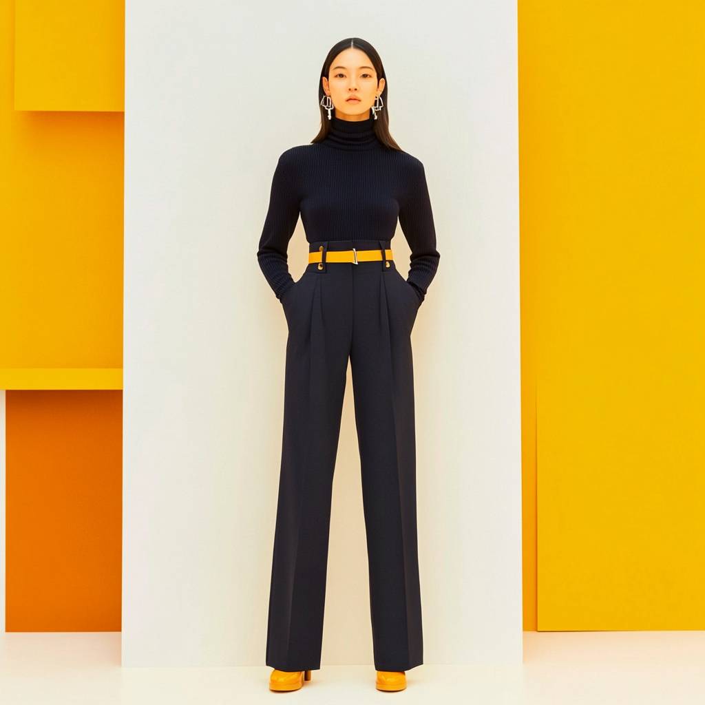 モデルは、スリムな黒のタートルネックとハイウエストトラウザーを着て、白い背景の前に立ち、服装のシンプルさとエレガンスを際立たせています。