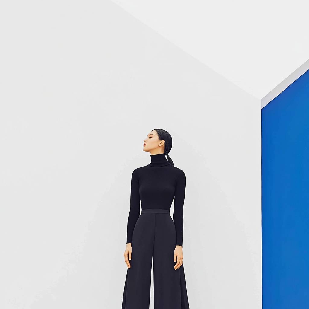 モデルはシンプルな黒のタートルネックとハイウエストのパンツを着用し、白い背景に対比して服のシンプルさと優雅さを強調しています。