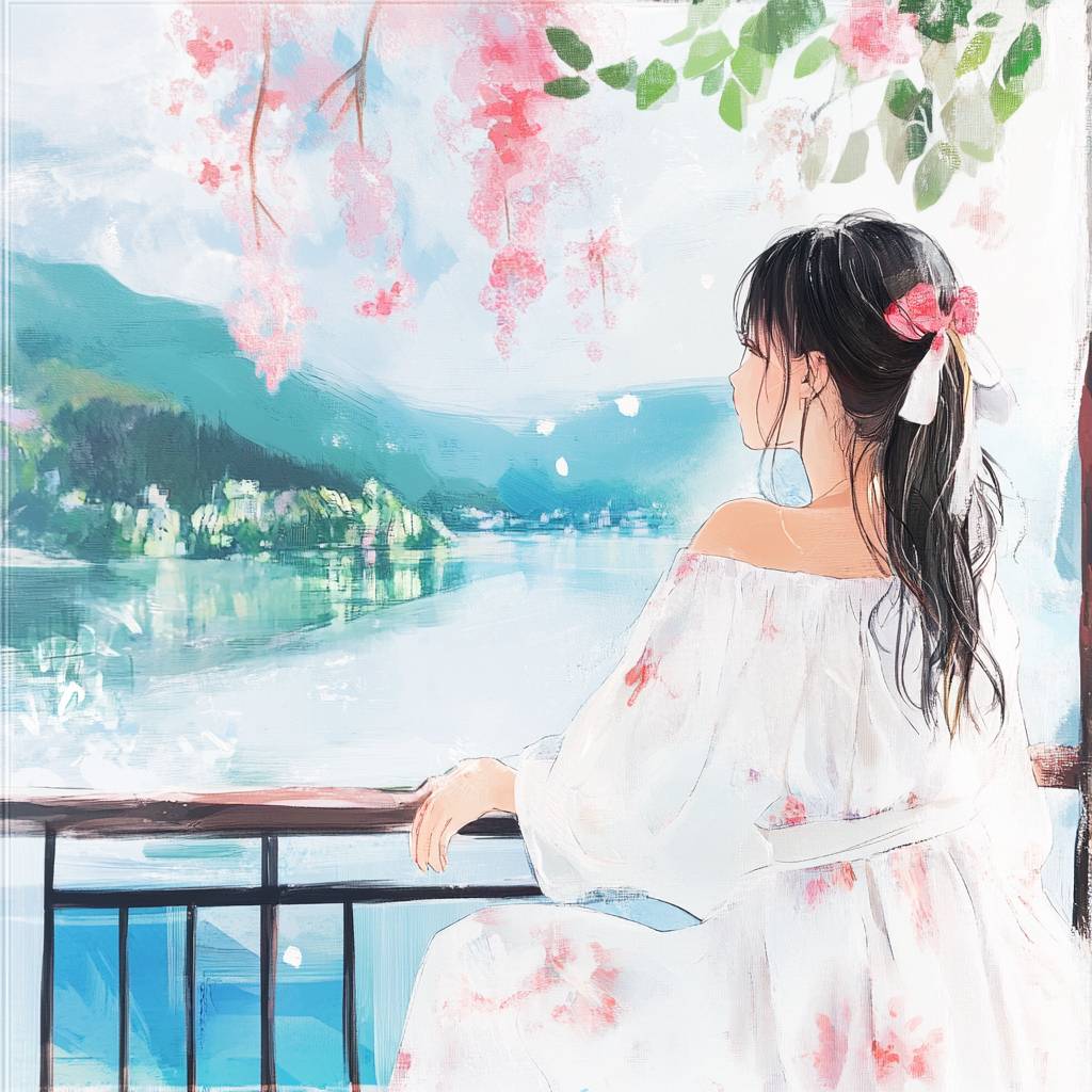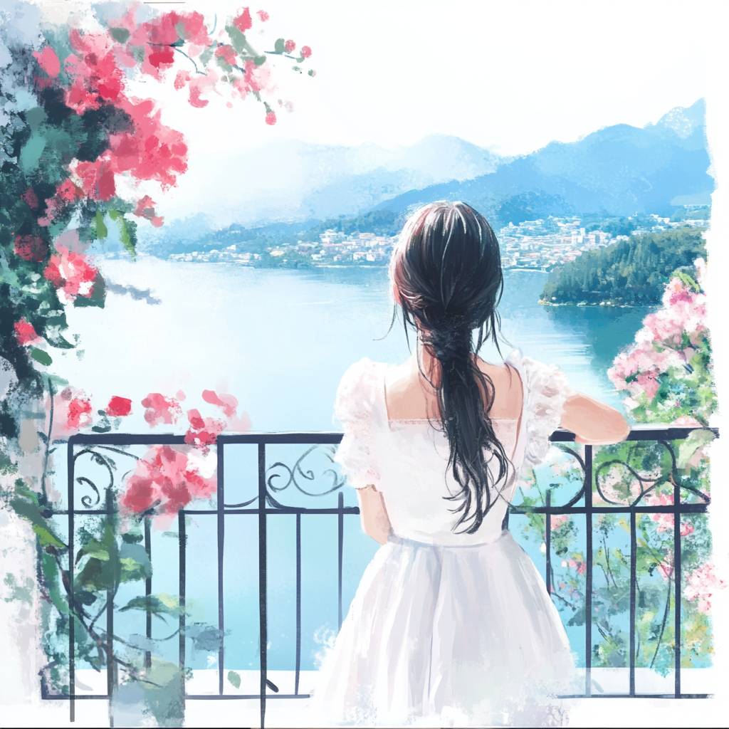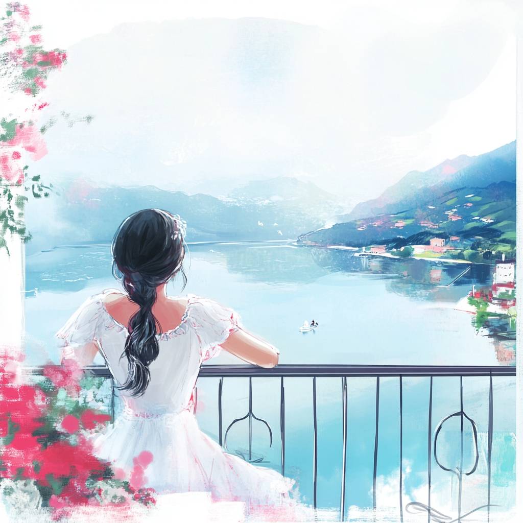 A beautiful woman overlooking a lake from her patio --sref 3276665900 --v 6.1