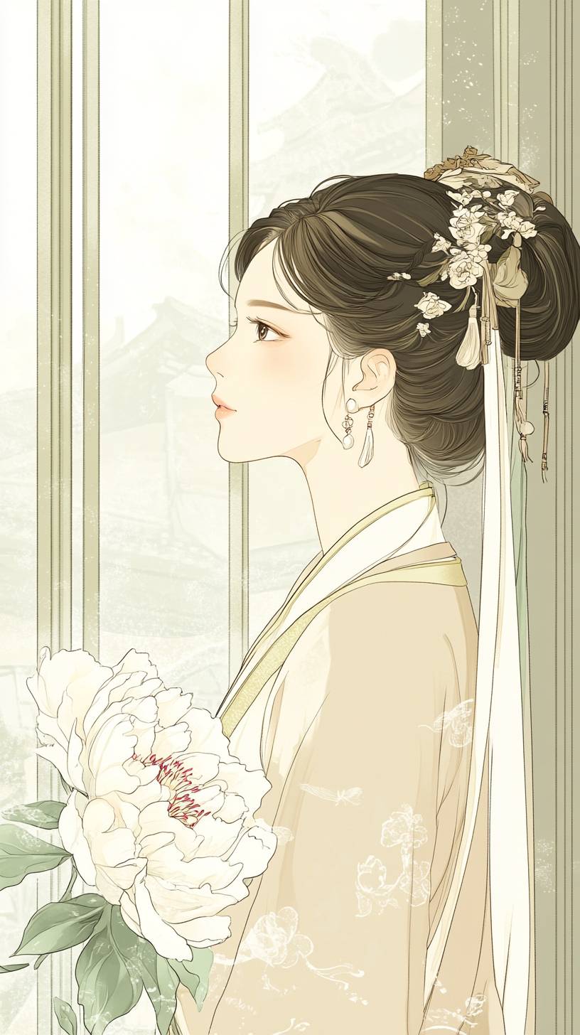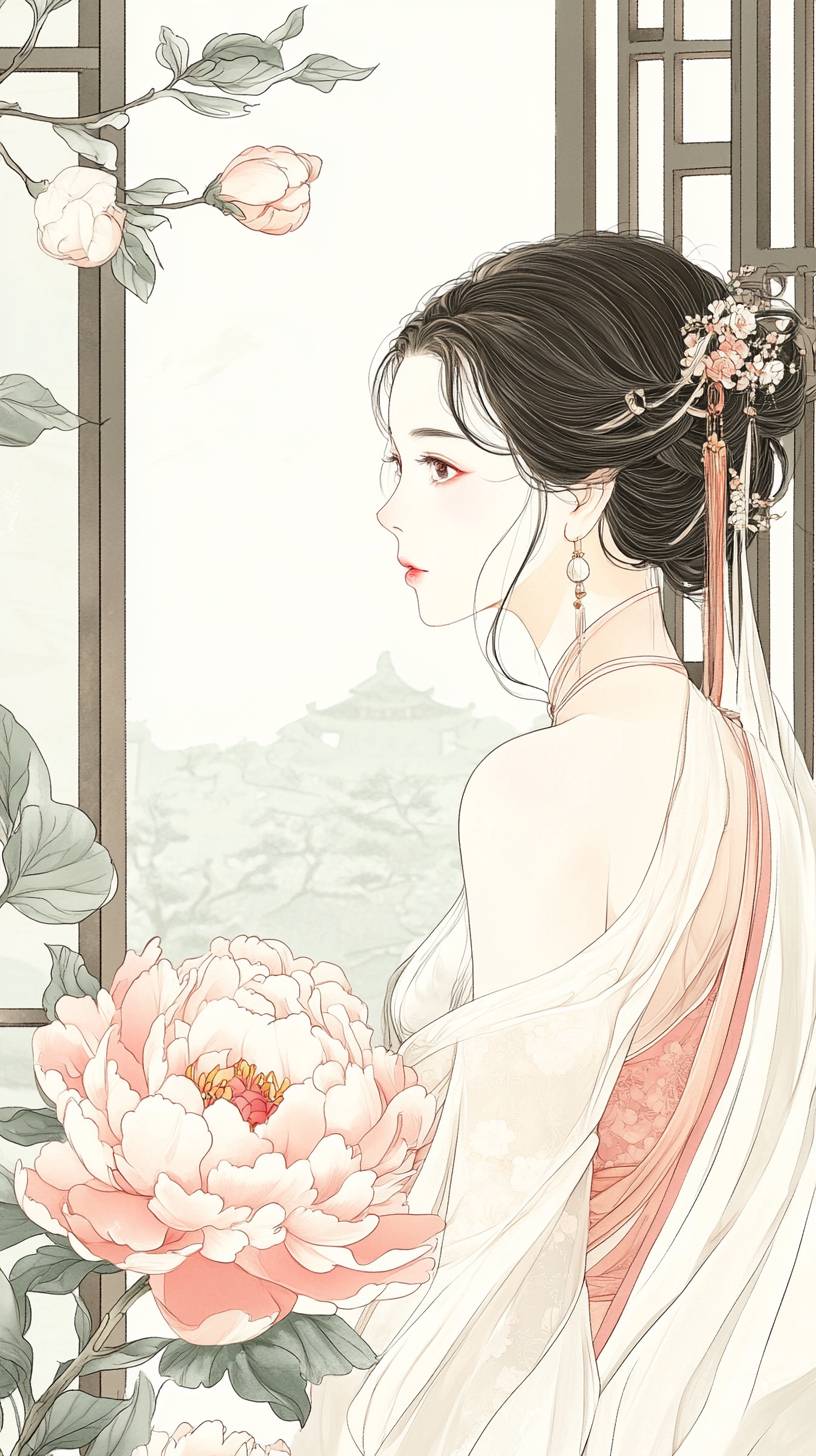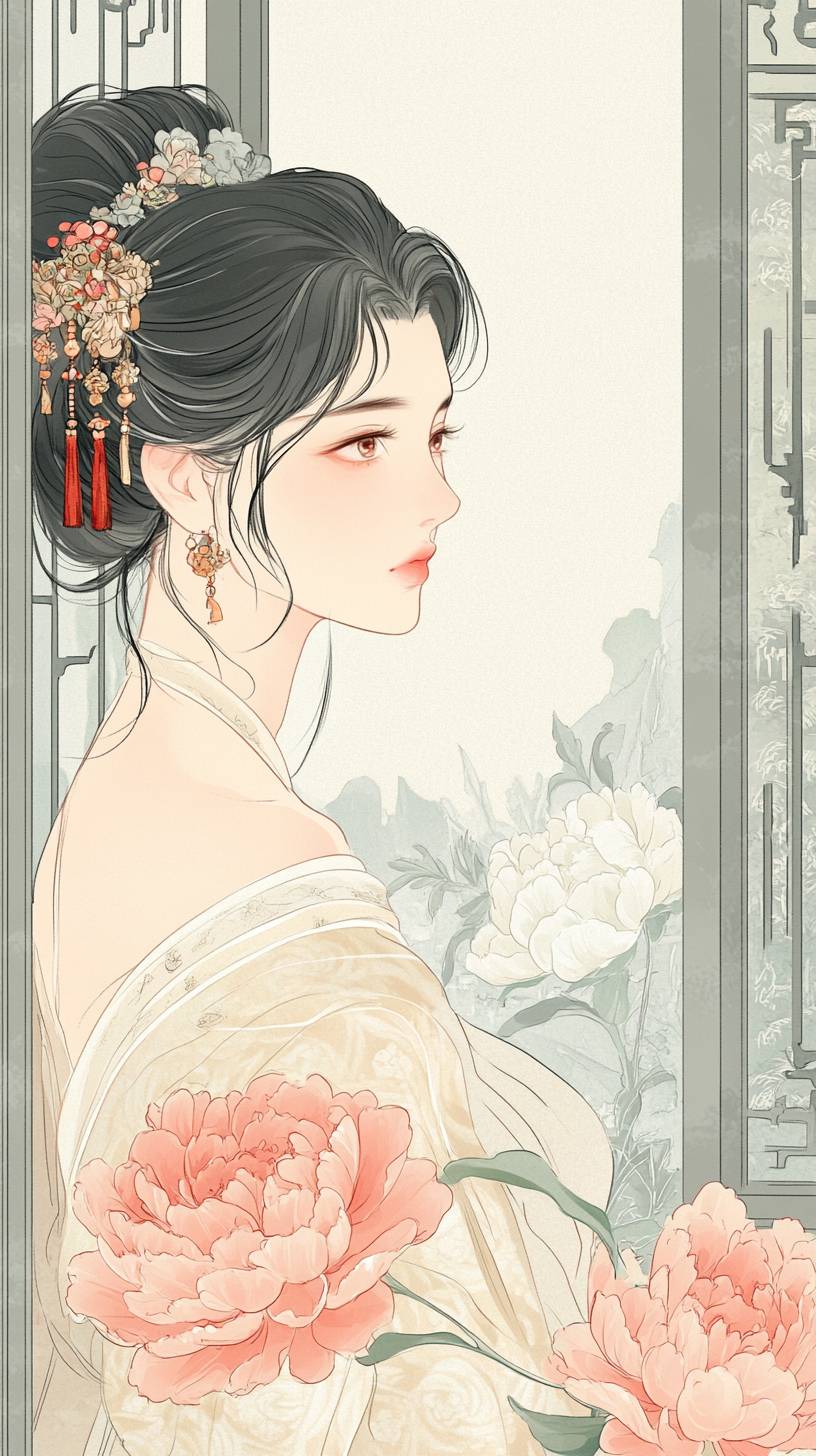 A classical comic-strip illustration of the Tang Dynasty palace scene, with silk material, pale color, simple line drawing of classical line, single line, uniform thin line drawing with ink, fine lines, clear and distinct line drawing, smooth and smooth. Mainly showing the scene of the Tang Dynasty palace. A bright peony is covered with dew and exudes a charming fragrance. The background is the hazy scenery of Wu Yun, creating a sad atmosphere. In the picture, there is a beautiful woman, plump in figure, leaning by the window, wearing a gorgeous new dress, and her eyes are touching. The overall picture is full of poetry and romance, showing the interweaving of classical beauty and emotions. Fine lines, ink line drawing, ancient style, pale color and light dyeing,,in clothes --ar 9:16 --v 6.1