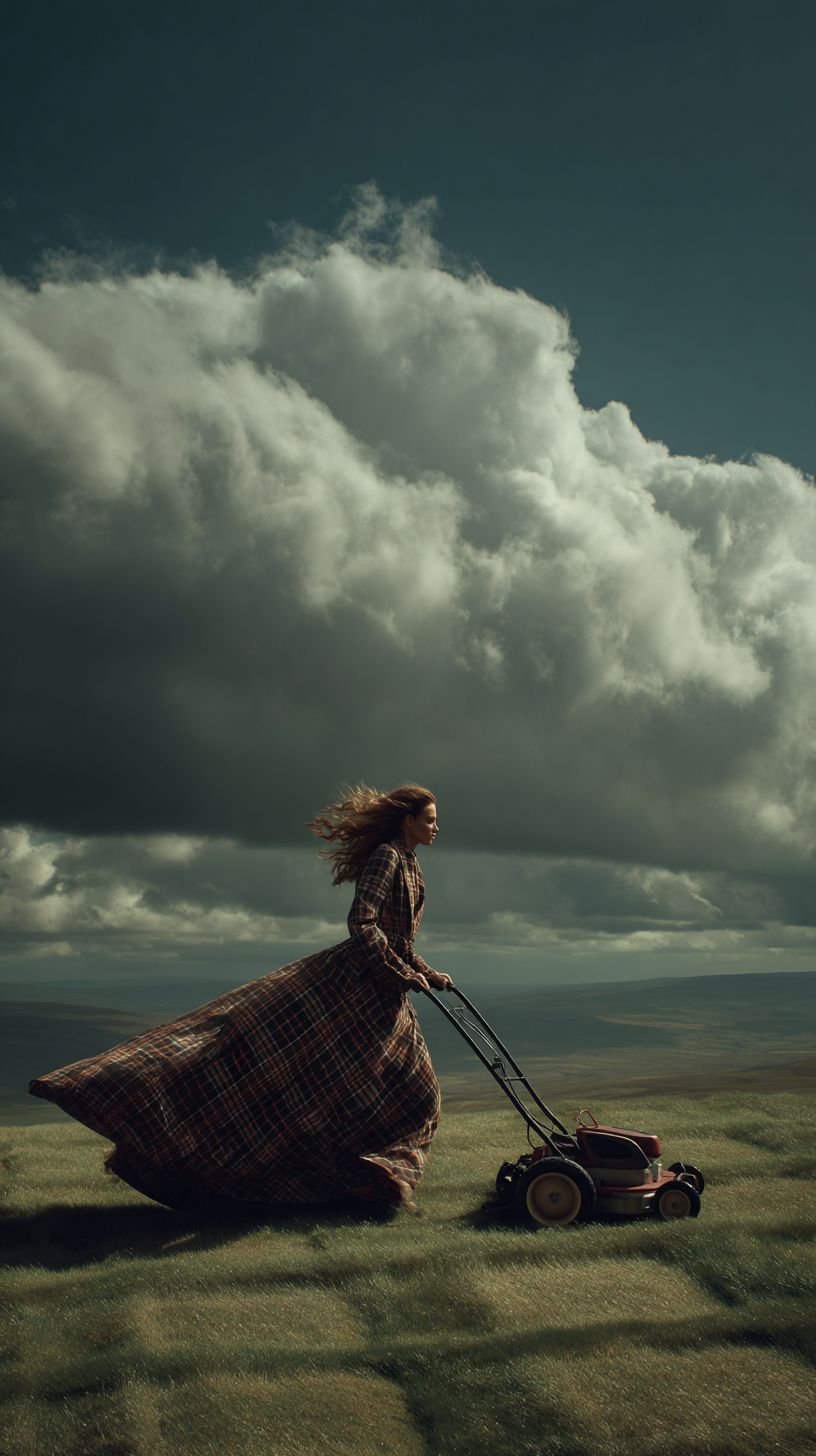 豪華な高解像度のファッションエディトリアル写真。劇的な雲の空の下、広大なスコットランドの草原を上から見た視点。グラマラスな女性がとても長いオーバーサイズのウールコートを着ており、ウエストで絞られていて、風に舞う15メートルのトレインがある。彼女は草の上で電動芝刈り機を押しており、上から見える精密なタータンパターンを作成している。彼女のボリュームのある、しっかりとしたカールの髪が風に揺れている。構図はグラフィックで映画的で、ダイナミックなフレーミングで、明暗の照明が質感、奥行き、動きを強調している。シーンはスコットランドの遺産、アバンギャルドなクチュール、洗練された雑誌エディトリアル美学を融合し、超現実的で映画的な雰囲気を醸し出している。