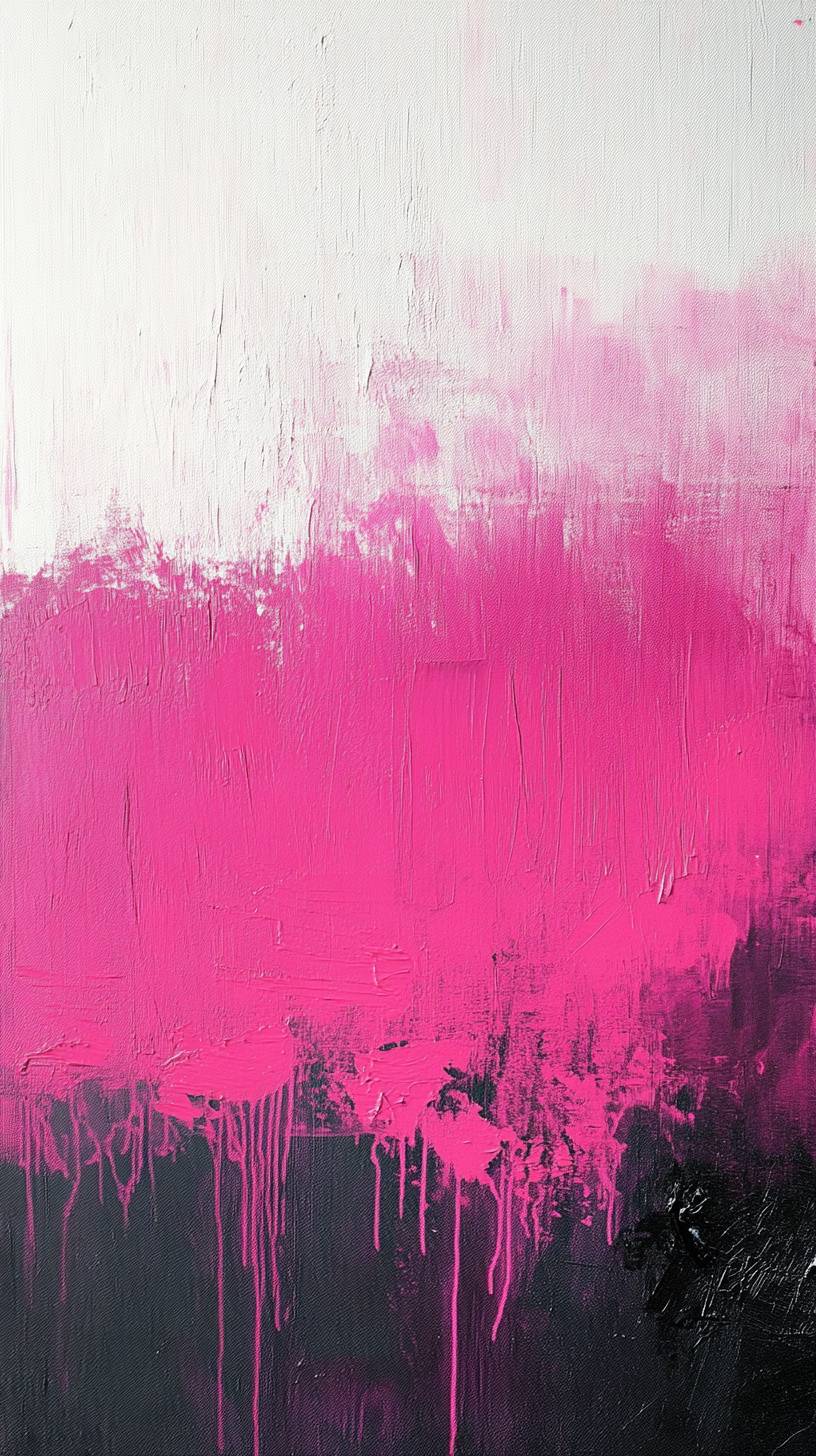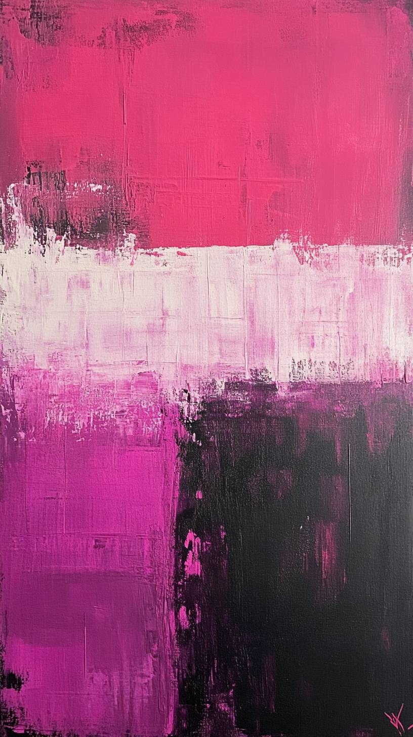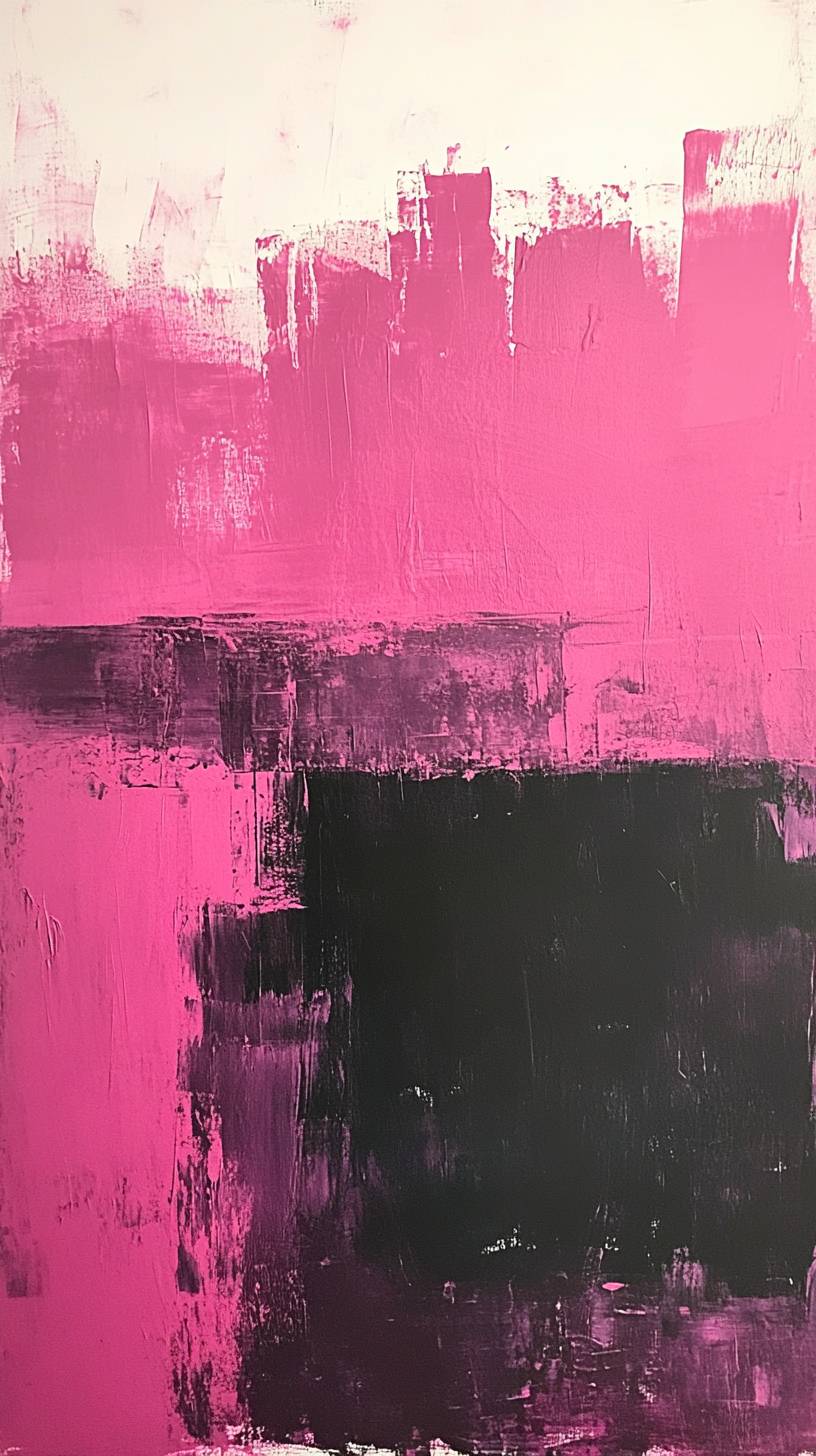 A pink and black abstract painting with textured brushstrokes on a white background. The canvas features pink color blocks, with splashes of red and deep purple. A large area of dark gray and deep purple creates a sense of layering, with pink brushstrokes covering half the picture. --ar 9:16 --v 6.1