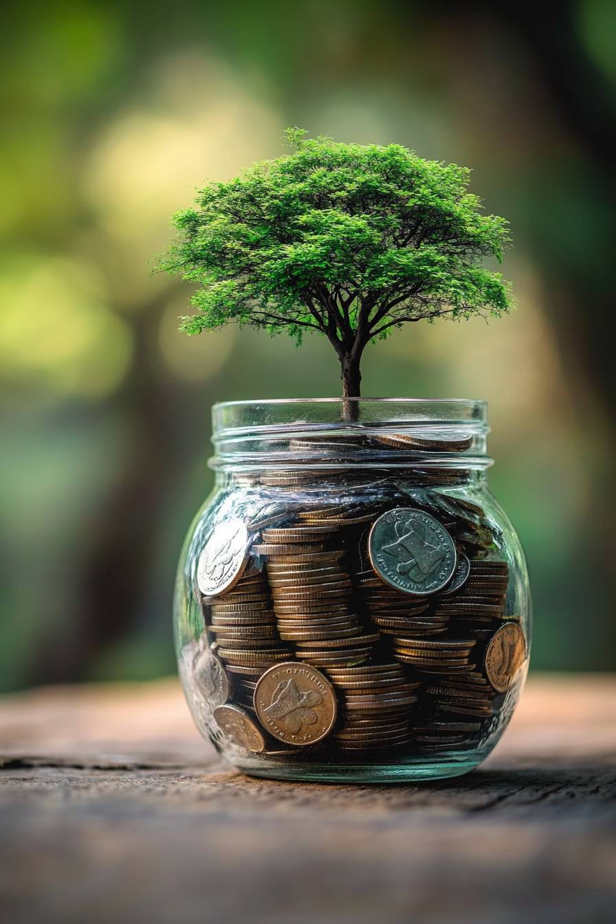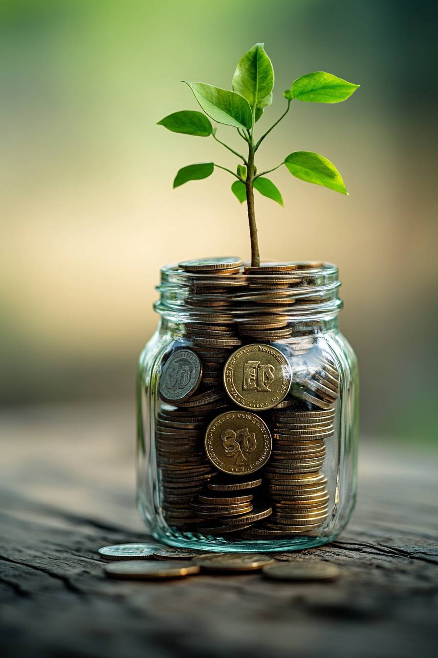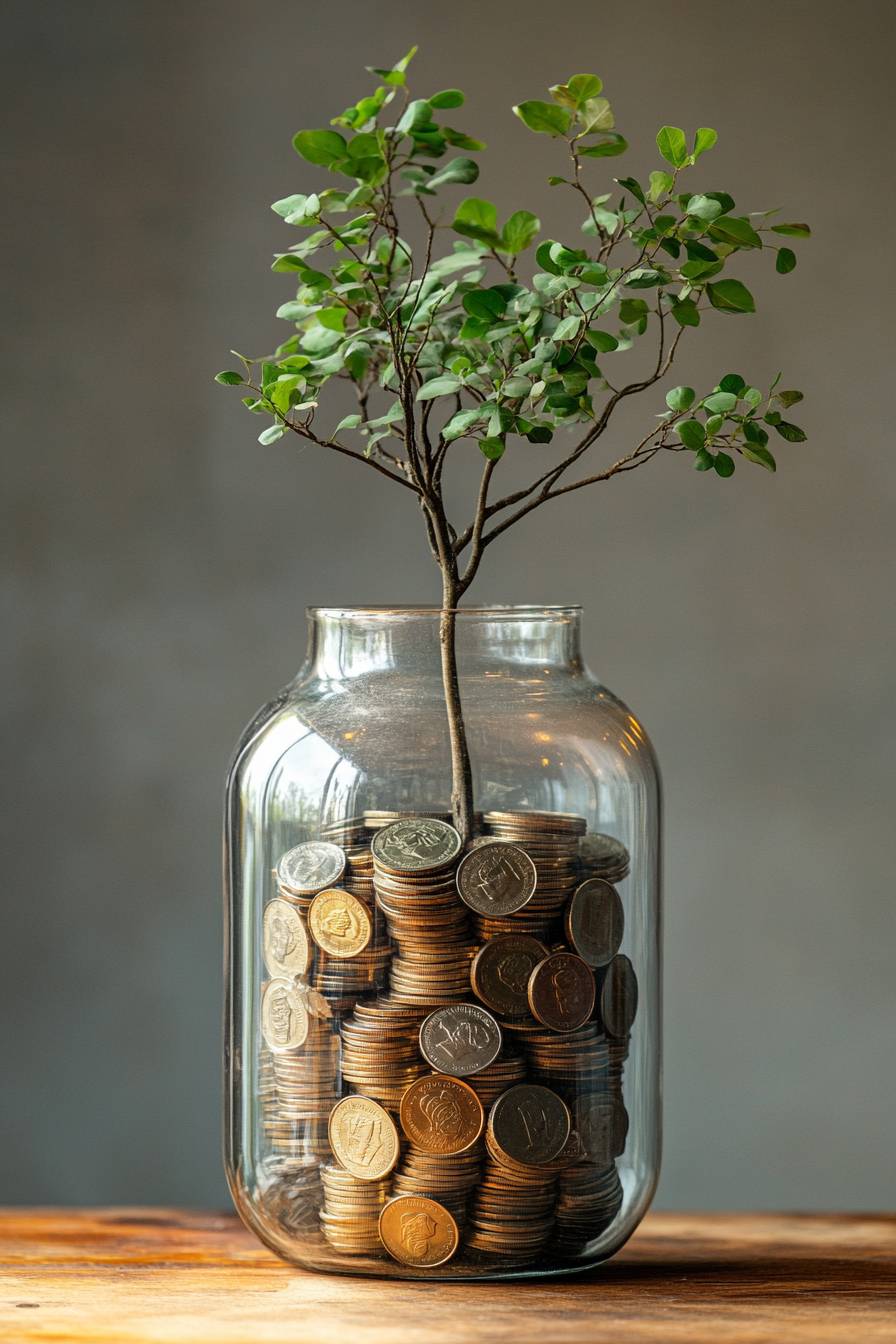成長するコインのスタックが入ったガラス瓶が、木のテーブルの上に置かれており、コインの上には小さな緑の木が芽を出している。背景はシンプル。