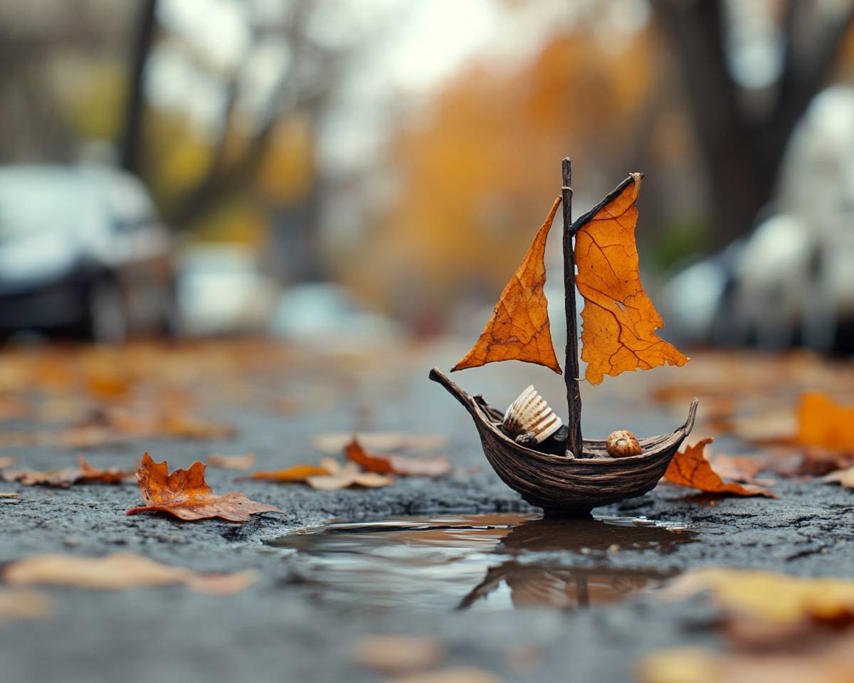 suburban street, pothole filled with water, a small nutshell with a sail made from an autumn leaf, ship of theseus style, stop motion animation, focus on the ship --chaos 3 --ar 5:4 --stylize 200 --v 6.1