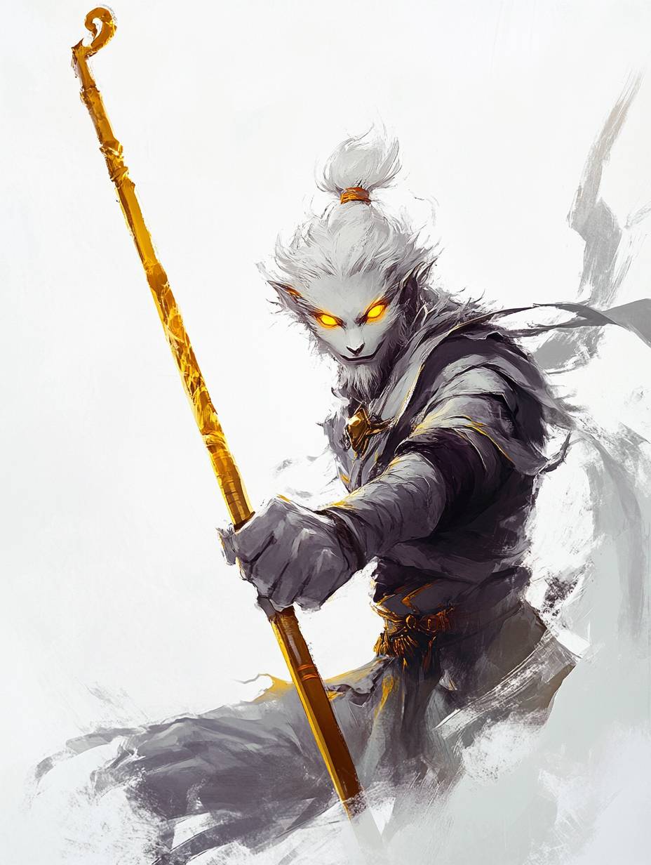 白い背景、黄色い目を持つ孫悟空が金の棒を持っている、シンプルなスケッチスタイル、キャラクターコンセプトデザインは新川洋司とピーター・モールバッハスタイルの影響を受けている。ハーフボディショット、フルボディポートレート、高コントラスト、強い光と影、ファンタジーイラストスタイル。背景は白で、微妙な筆致があり、神秘と魔法の雰囲気を作り出している。