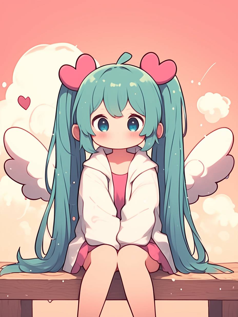 ミニマリストで可愛いシンプルな妖精、長い髪と小さな白い翼を持った初音ミクが、夢川の背景の前でチビスタイルで描かれています。